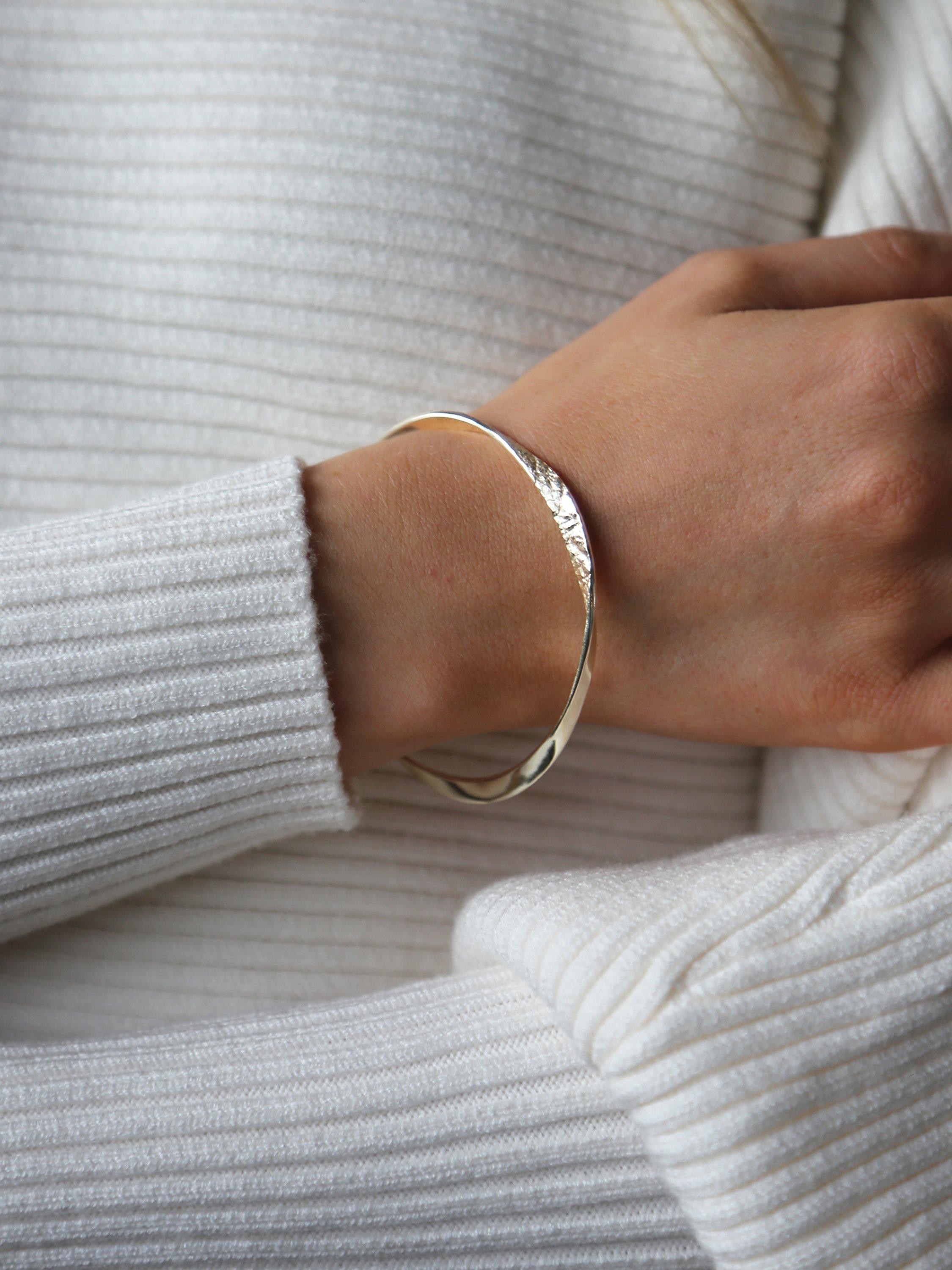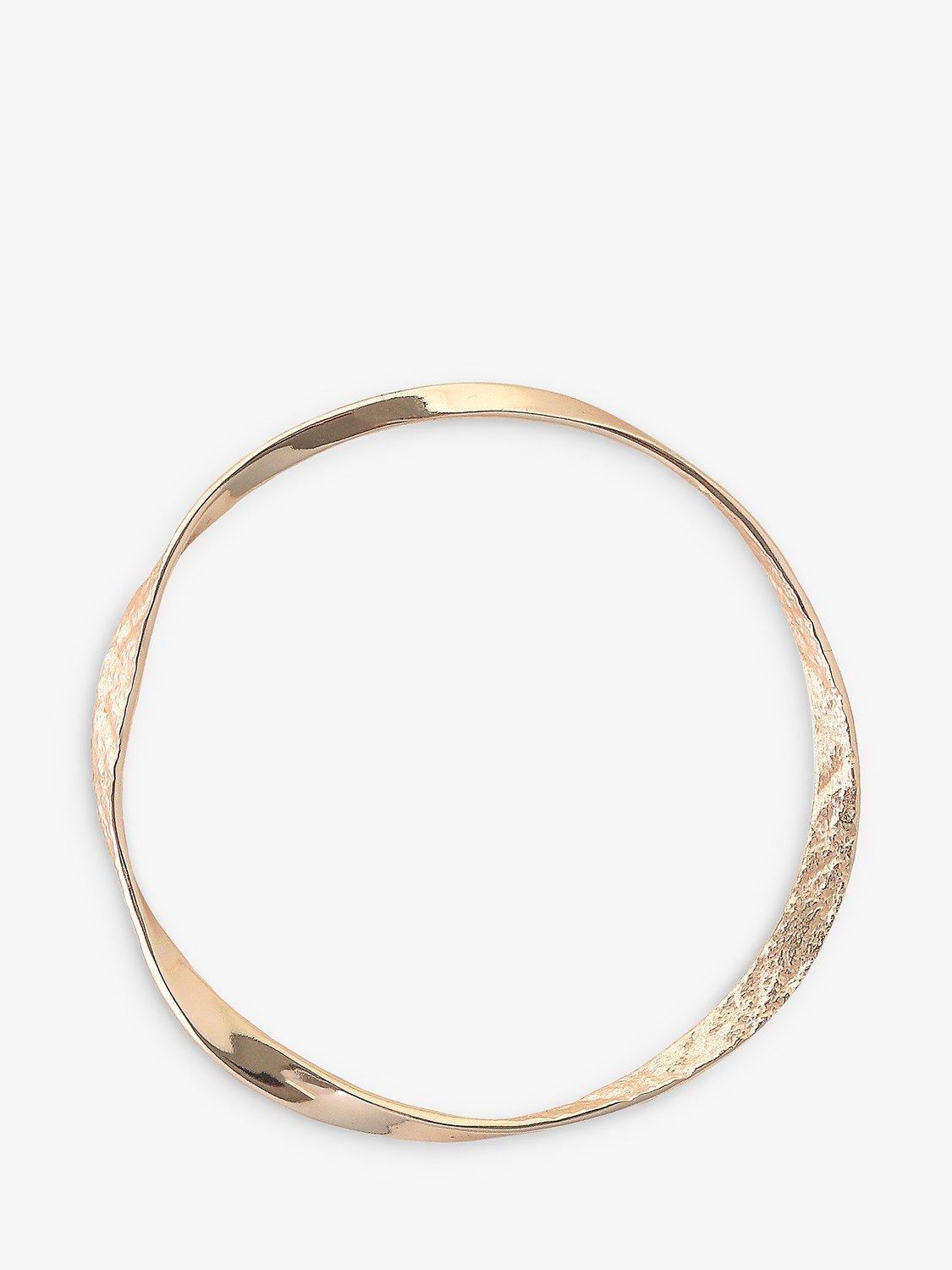 This Tutti & Co twisted bangle features a beautiful textured design that gives a fine tactile finish. The bangle can be layered with other bracelets or worn on its own.