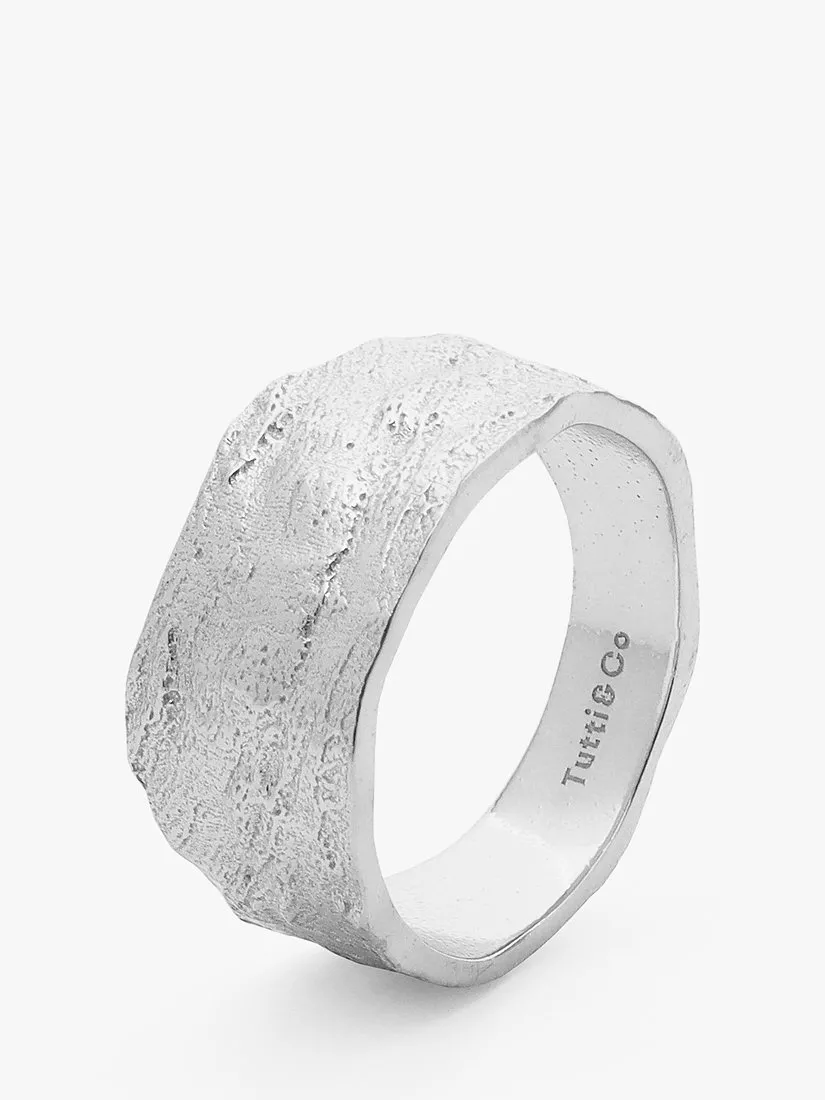 Designed to an uneven chunky shape with a textured finish, this statement band ring is inspired by the brand's coastal surroundings. The ring arrives in a signature branded soft cloth pouch, made from recycled materials.