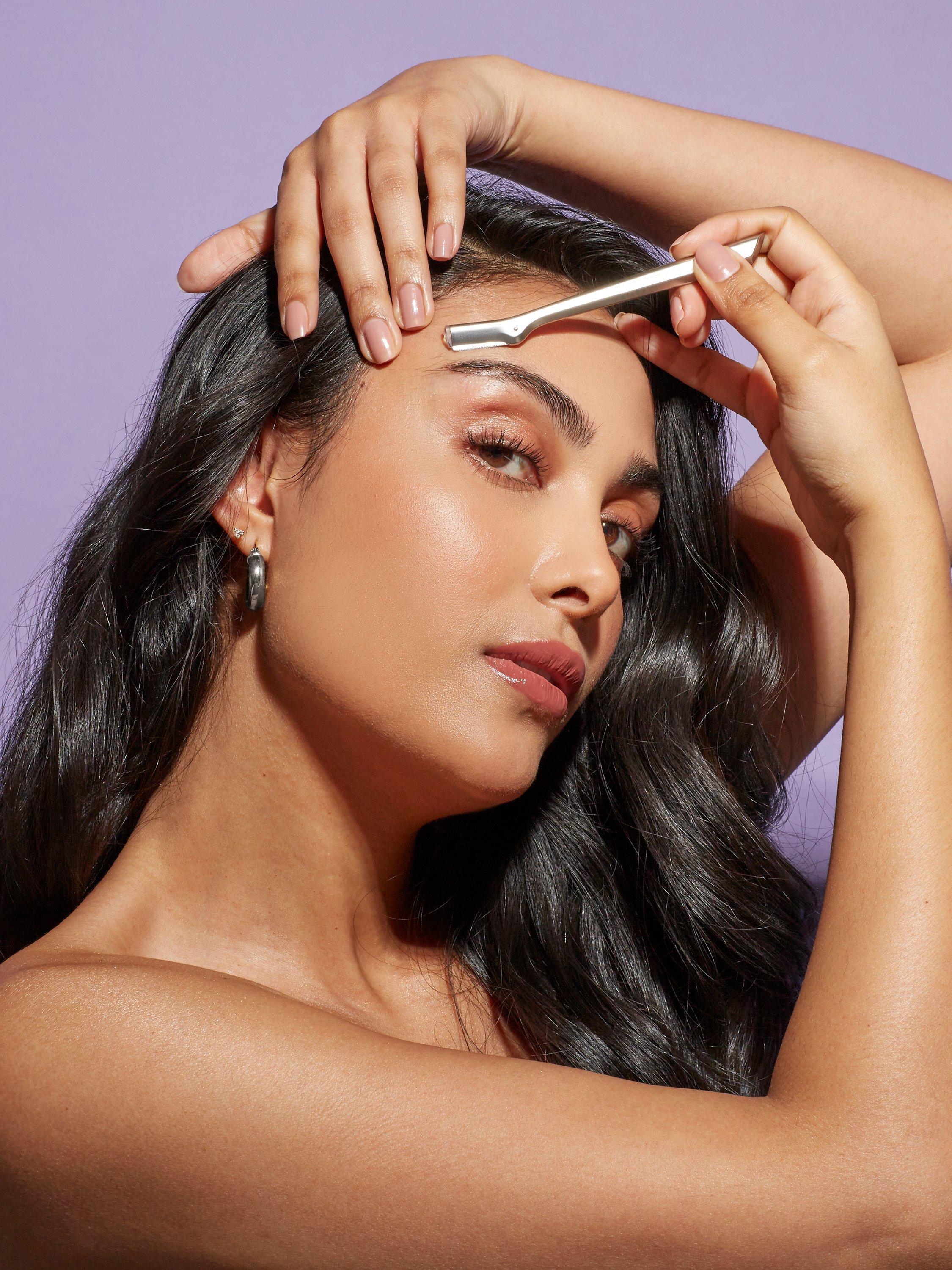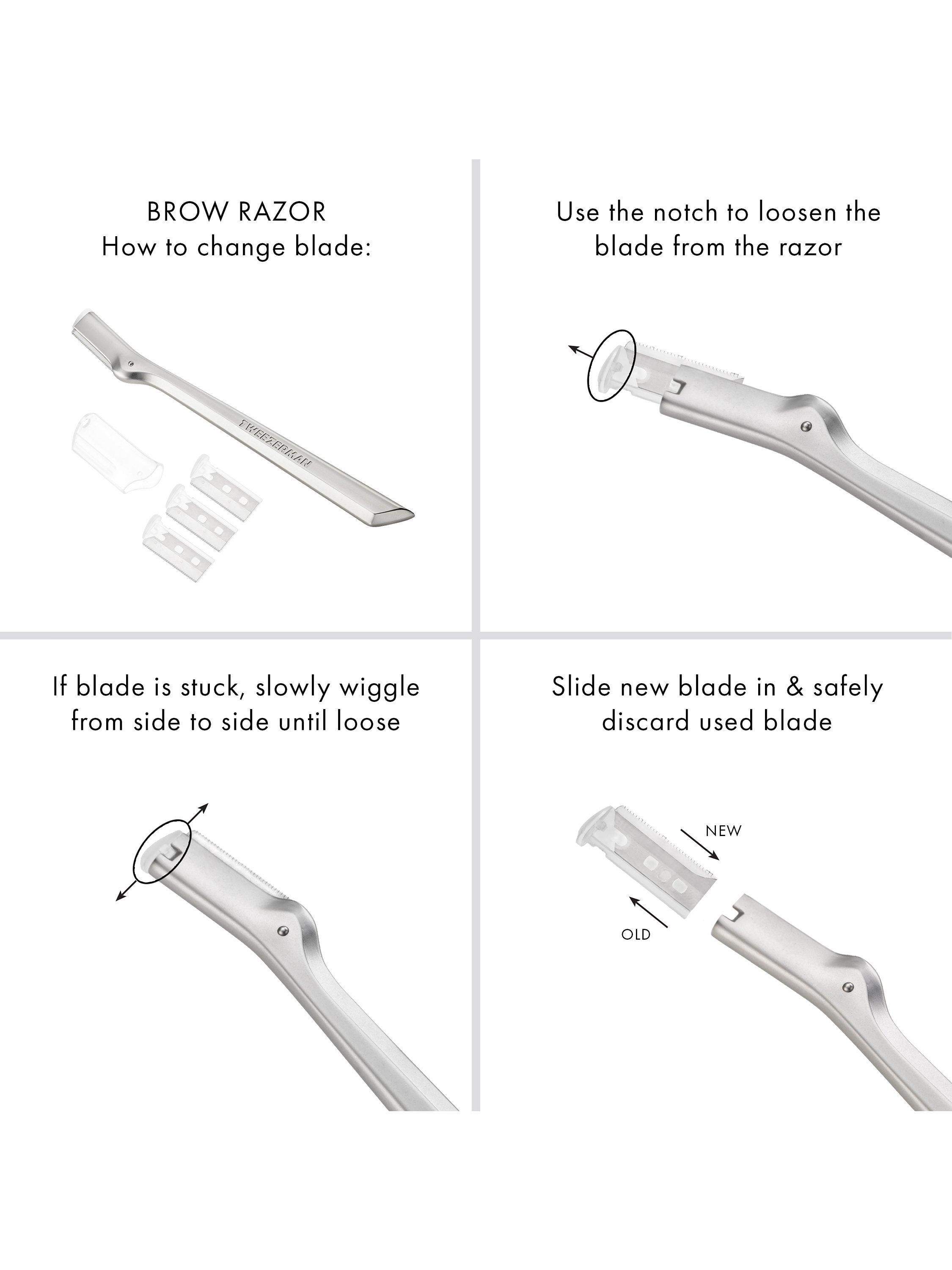 Remove cap from tool, hold the brow razor at an angle and with light pressure, apply short, feathery strokes downward to remove unwanted hair. To avoid irritation, move in the direction of hair growth. Use once per week. Do not use more than 3 times per area. For optimal performance, replace razor blades every 2-3 months or as needed. Clean razor with an alcohol wipe before and after each use. Once dry, replace cap and store. To replace blades, pinch the plastic edge and pull out from tool. If blade is stuck, slowly wiggle from side to side until loose. Slide new blade in and safely discard of used blade. Handle with care, blade is sharp.