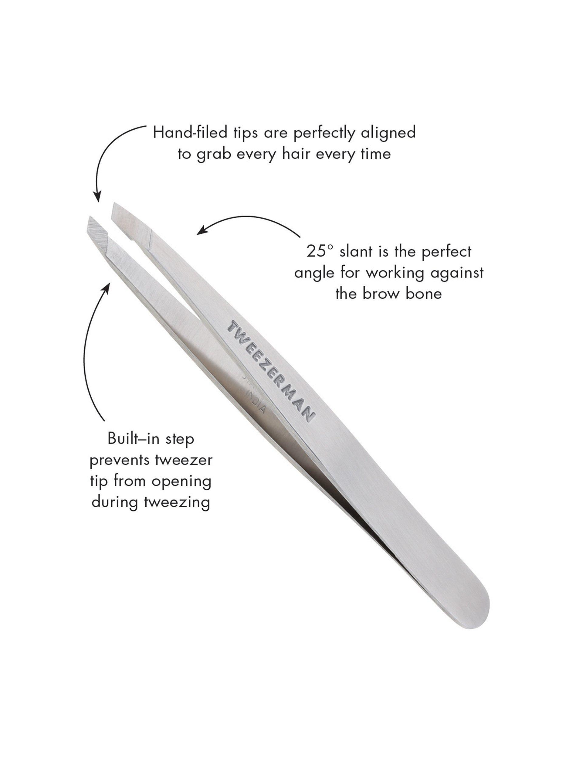 High-grade tweezers, with hand-filed and carefully aligned tips. Stainless steel, with slanted tips ideal for brow shaping.