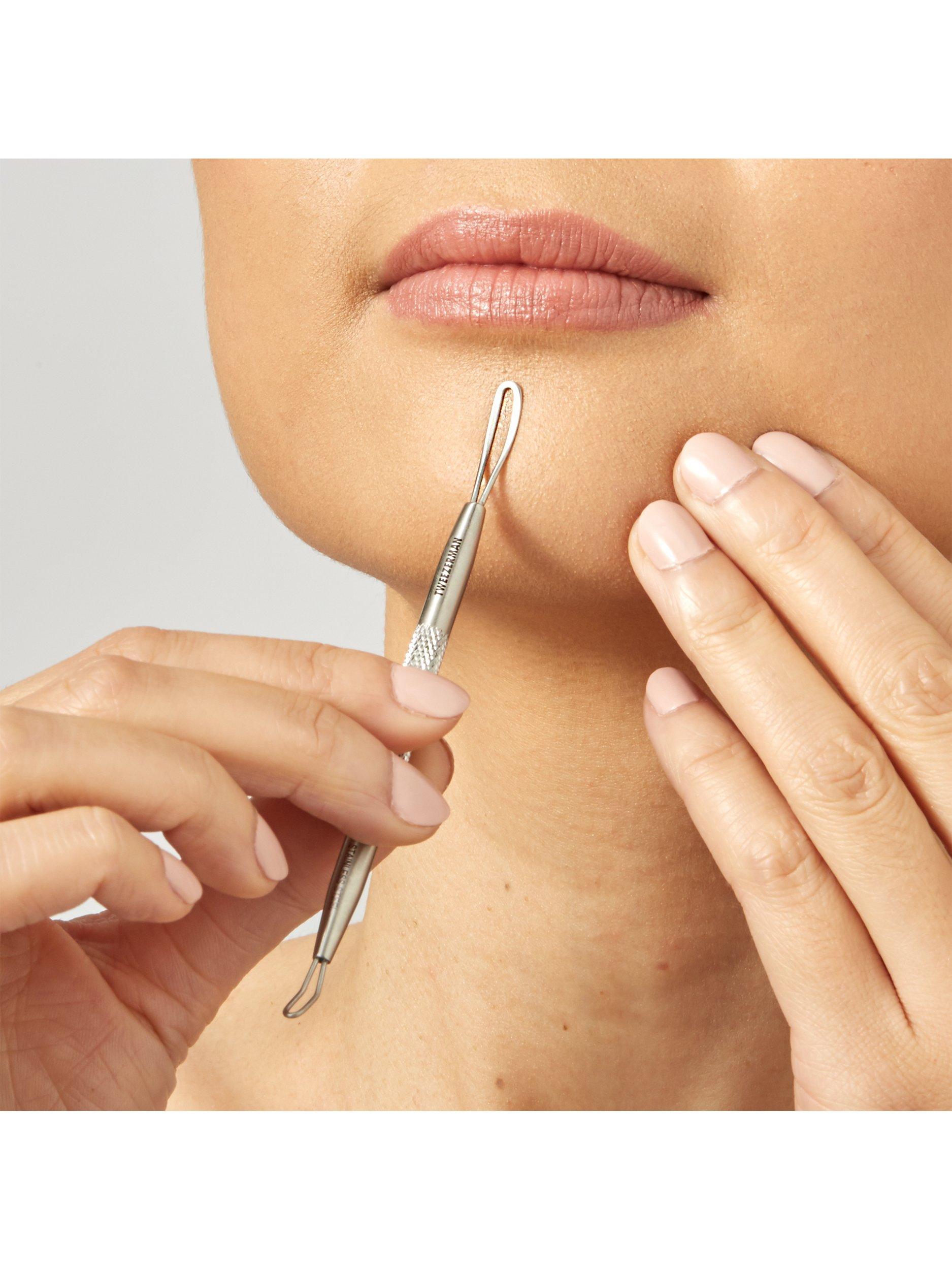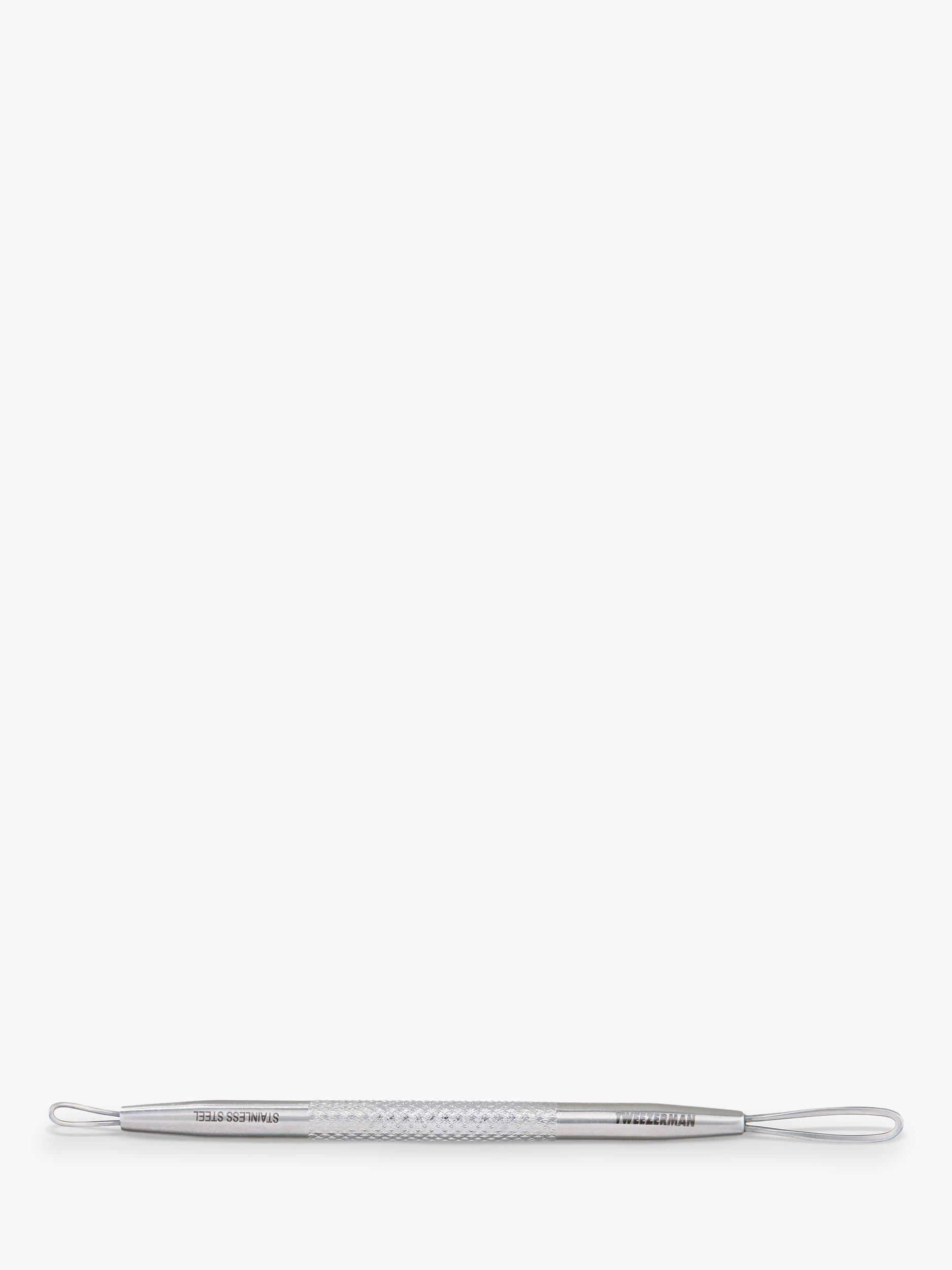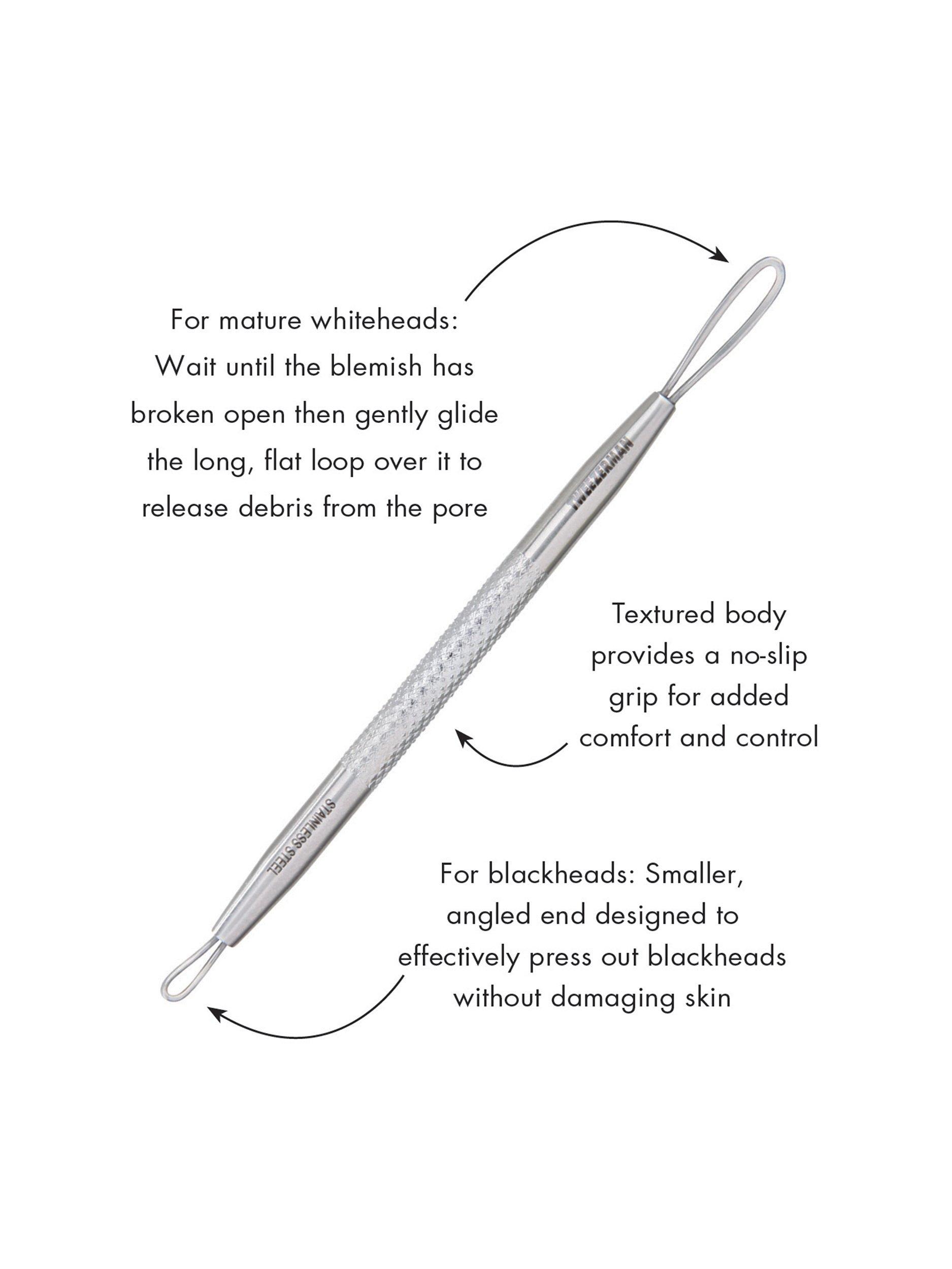 This handy skincare tool features a textured grip for maximum control, with a thin angled loop for rolling out whiteheads and a flat side for pressing out blackheads.