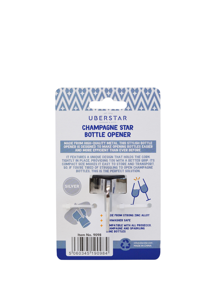 An essential tool for any champagne, prosecco or sparkling wine lover, this bottle opener from Uberstar is made from high-quality metal in a stylish design to make opening bottles easier and more efficient.