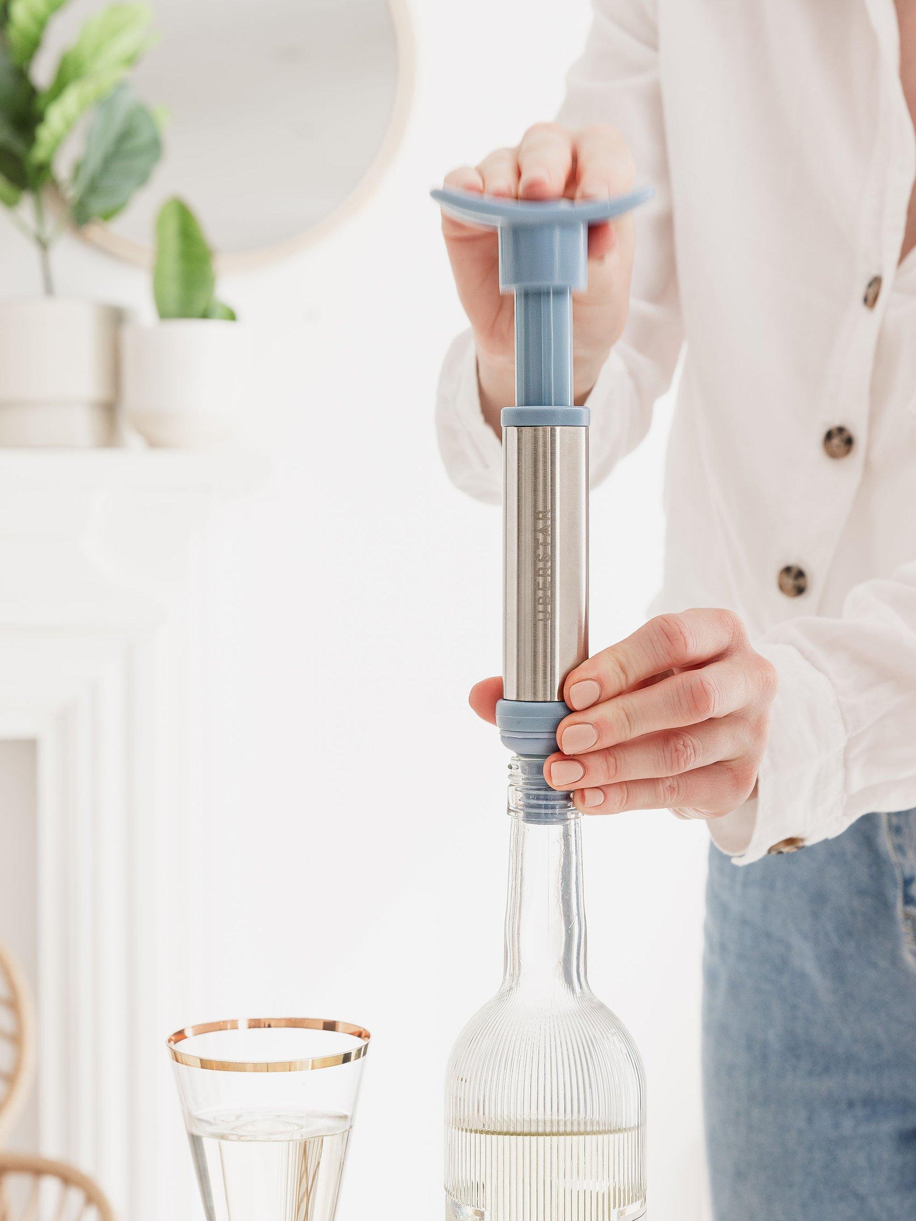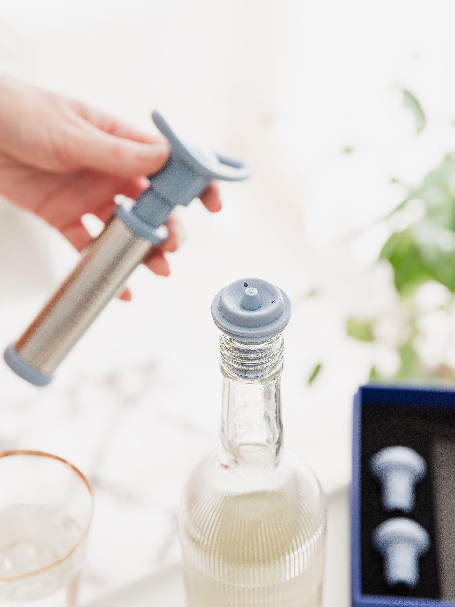 Simply slot an included silicone stopper in an open bottle of wine. Place the pump on top, then press down and pull up to extract air until you feel resistance. The silicone wine stoppers also eliminate the inconvenience of leakage, as they form an airtight seal. Easy to release, just price the toggle on the stopper and you'll hear the rush of air as it rebalances. Then pull the stopper out of the bottle. Pour and enjoy.