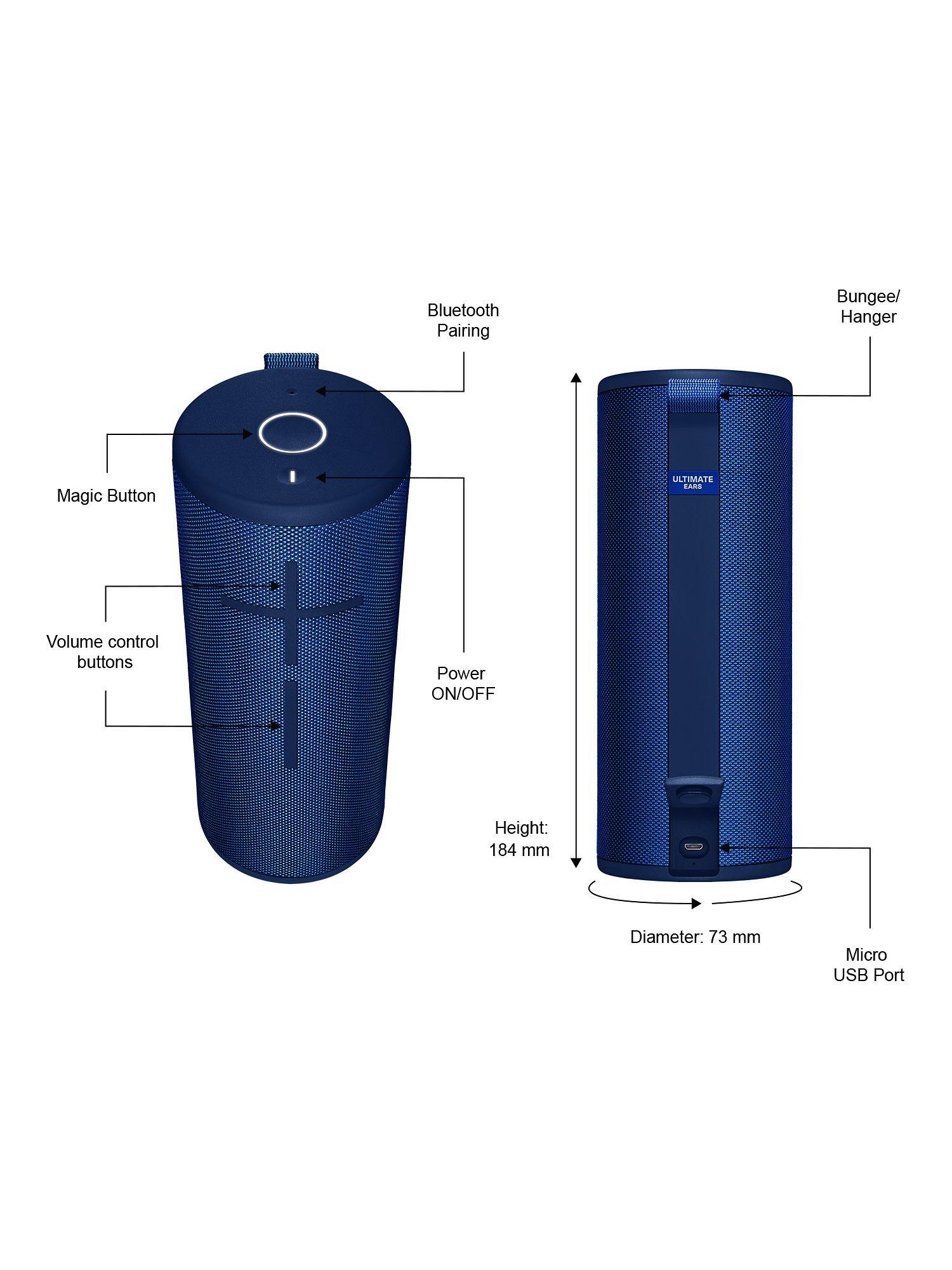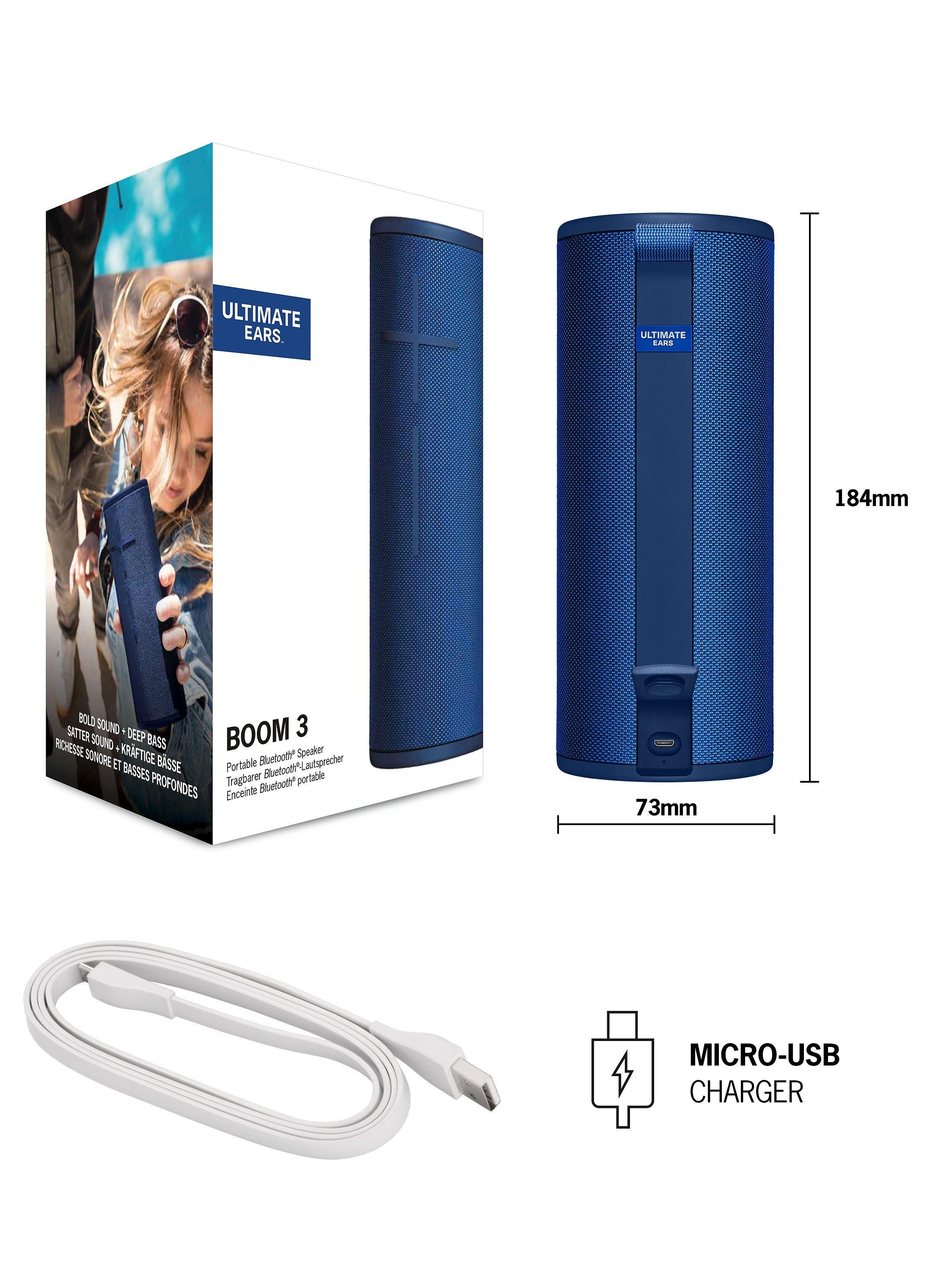 Refined and redesigned, the Ultimate Ears BOOM 3 is a super-portable wireless speaker built for adventure. It rocks 360° sound and is waterproof, dust-proof and drop-proof. The BOOM 3 features the 'magic' button for hands-on control and a wider Bluetooth range than previous models.
