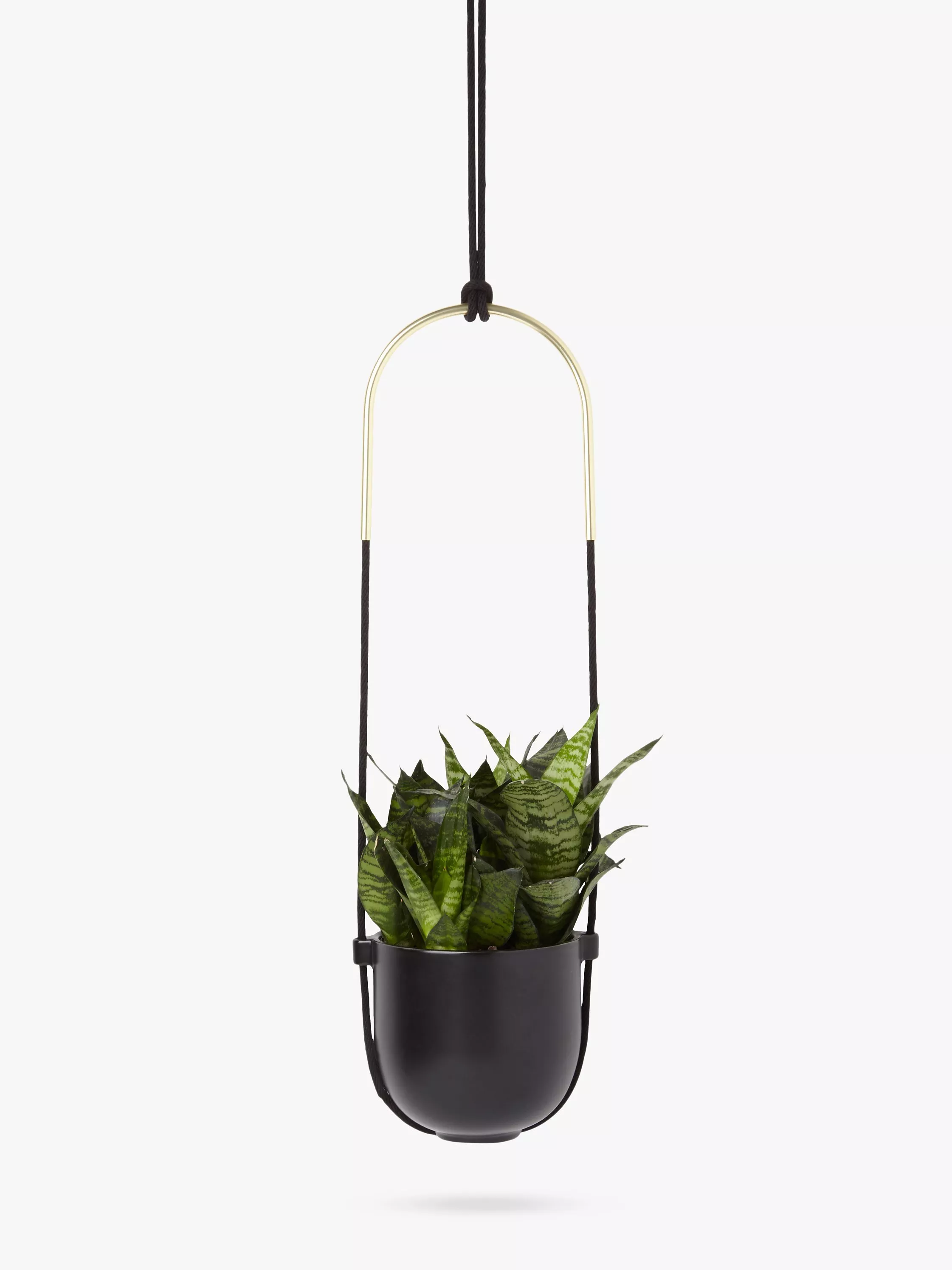 Hanging plants add a sense of height to a space. The Bolo ceramic pot is suspended by a matching rope design with curved metal in a brass finish creating a contemporary look. Easy to mount on the wall or ceiling, it's ideal for ferns, succulents and other greenery to bring the outdoors in. The matching hanging hook and fittings are included.