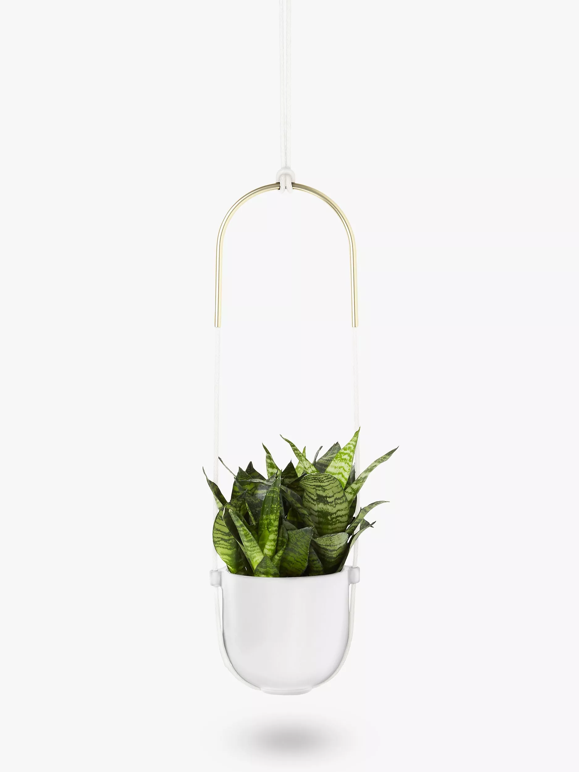 Hanging plants add a sense of height to a space. The Bolo ceramic pot is suspended by a matching rope design with curved metal in a brass finish creating a contemporary look. Easy to mount on the wall or ceiling, it's ideal for ferns, succulents and other greenery to bring the outdoors in. The matching hanging hook and fittings are included.