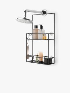 It features drainage holes built throughout it, ensuring your products dry quickly and each shelf has two larger holes that allow shampoo bottles to be stored spout down, so product can be dispensed more easily.