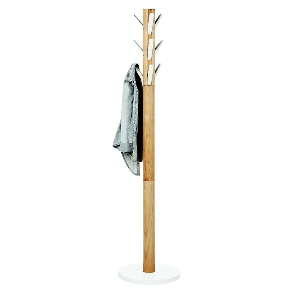 Bring a taste of the natural world inside, with this standing wooden coat rack that looks part cactus and part pine branch, with 9 thorn-like hooks that flip down for use.