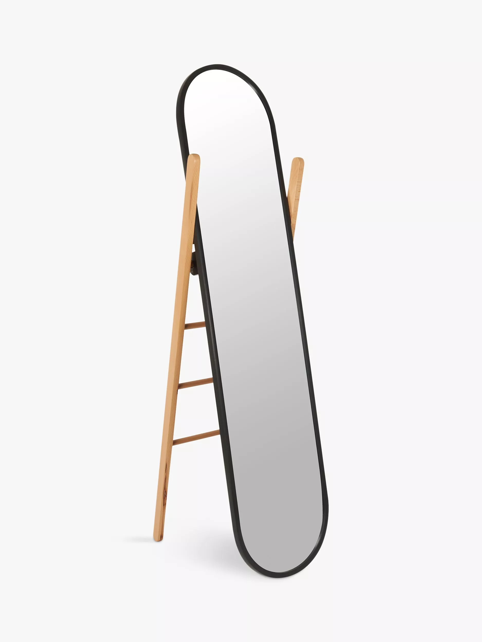 This unique crossover design has a little bit of everything, and blends functionality with a Scandavian style. The moveable floor-length mirror, with its protective rubber rim detail, sits like a canvas on a wooden easel. The easel, a callback to bunk-bed style ladders, can also hang clothes and accessories, to help you get out the door faster.