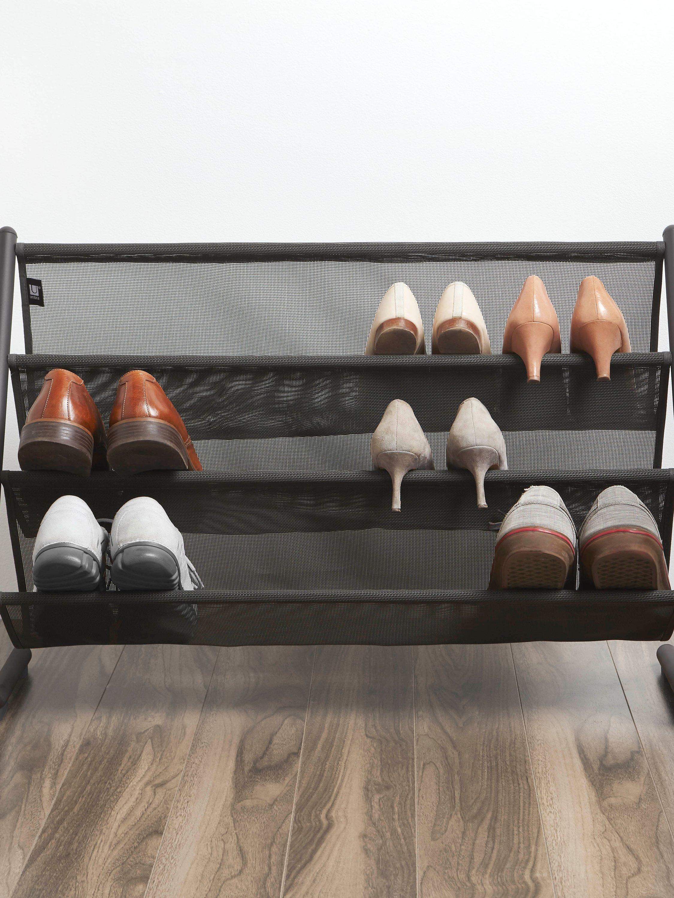 This steel wire shoe rack, with mesh shelves, can hold up to 12 pairs of shoes.