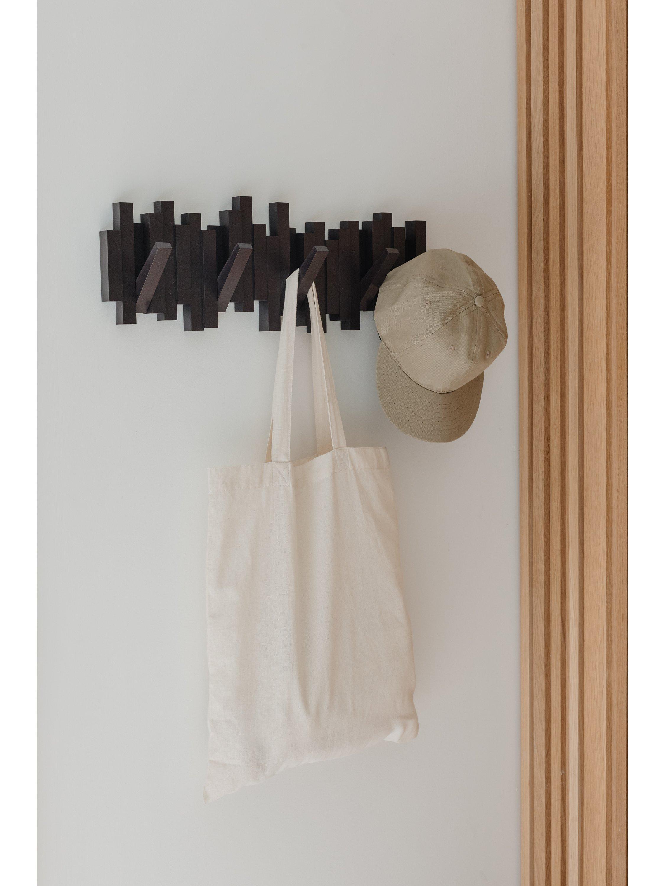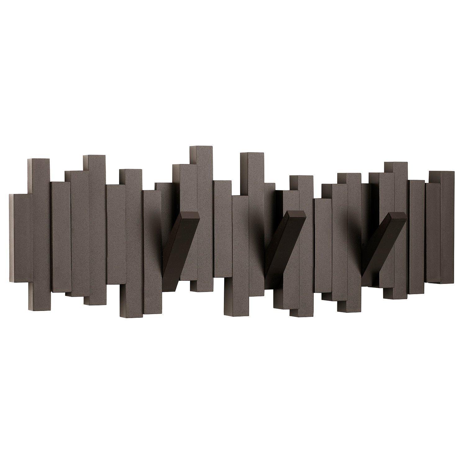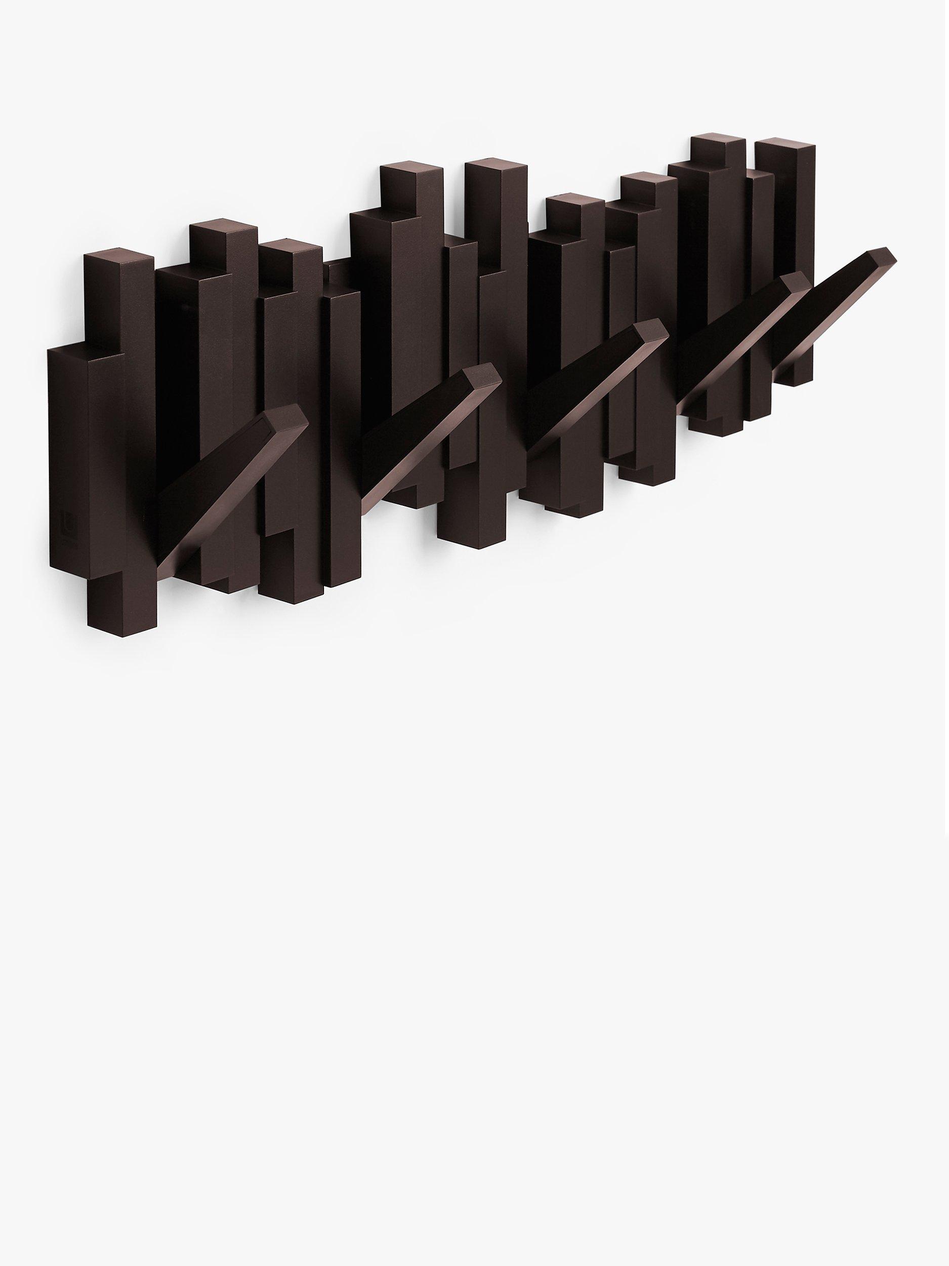 This innovative piece includes five flip down hooks. Each hook holds up to 2.3 kg. Great for small spaces and duels as wall décor when not used for hanging articles. Mounting hardware included.