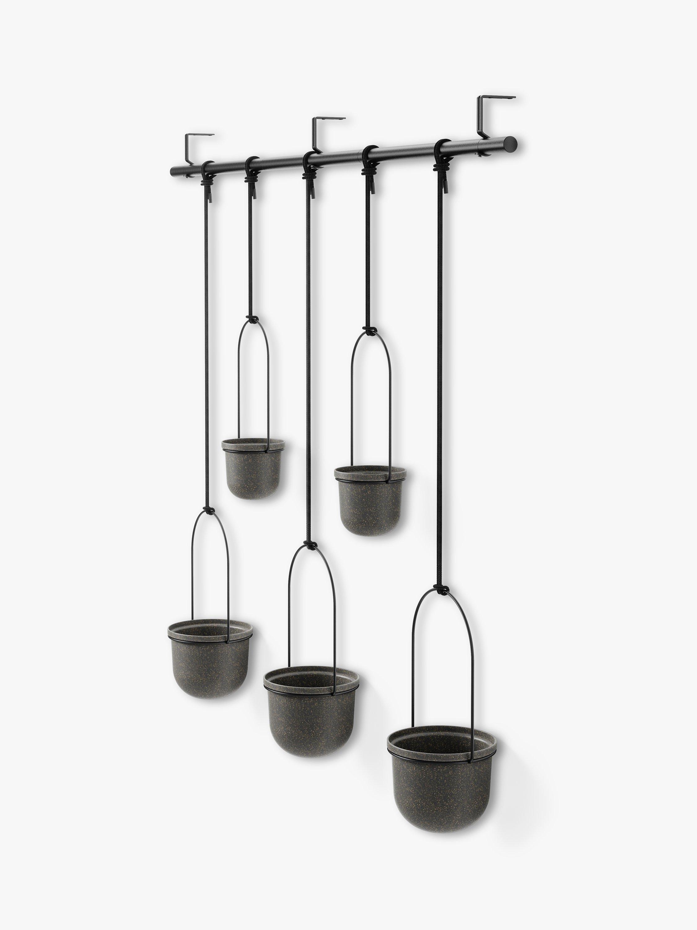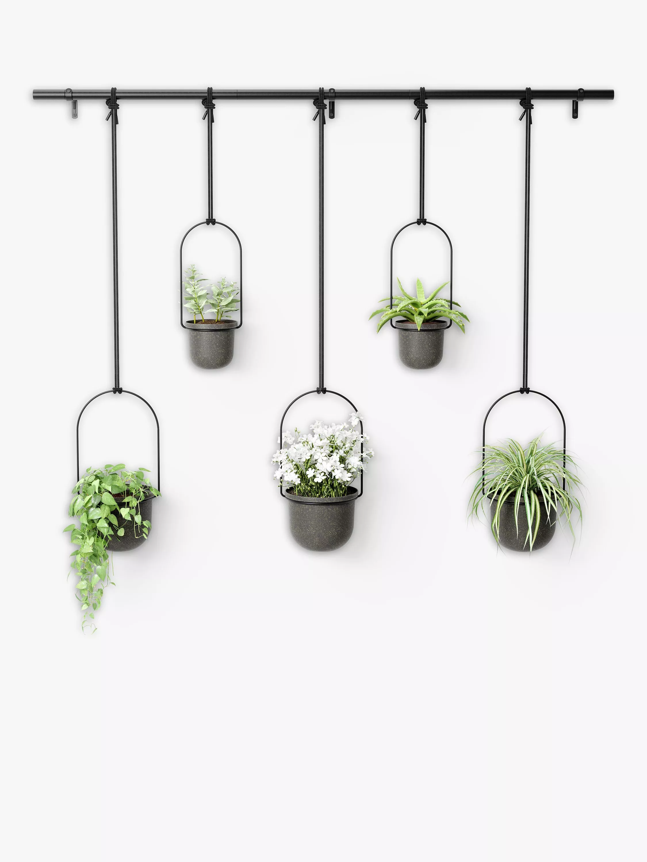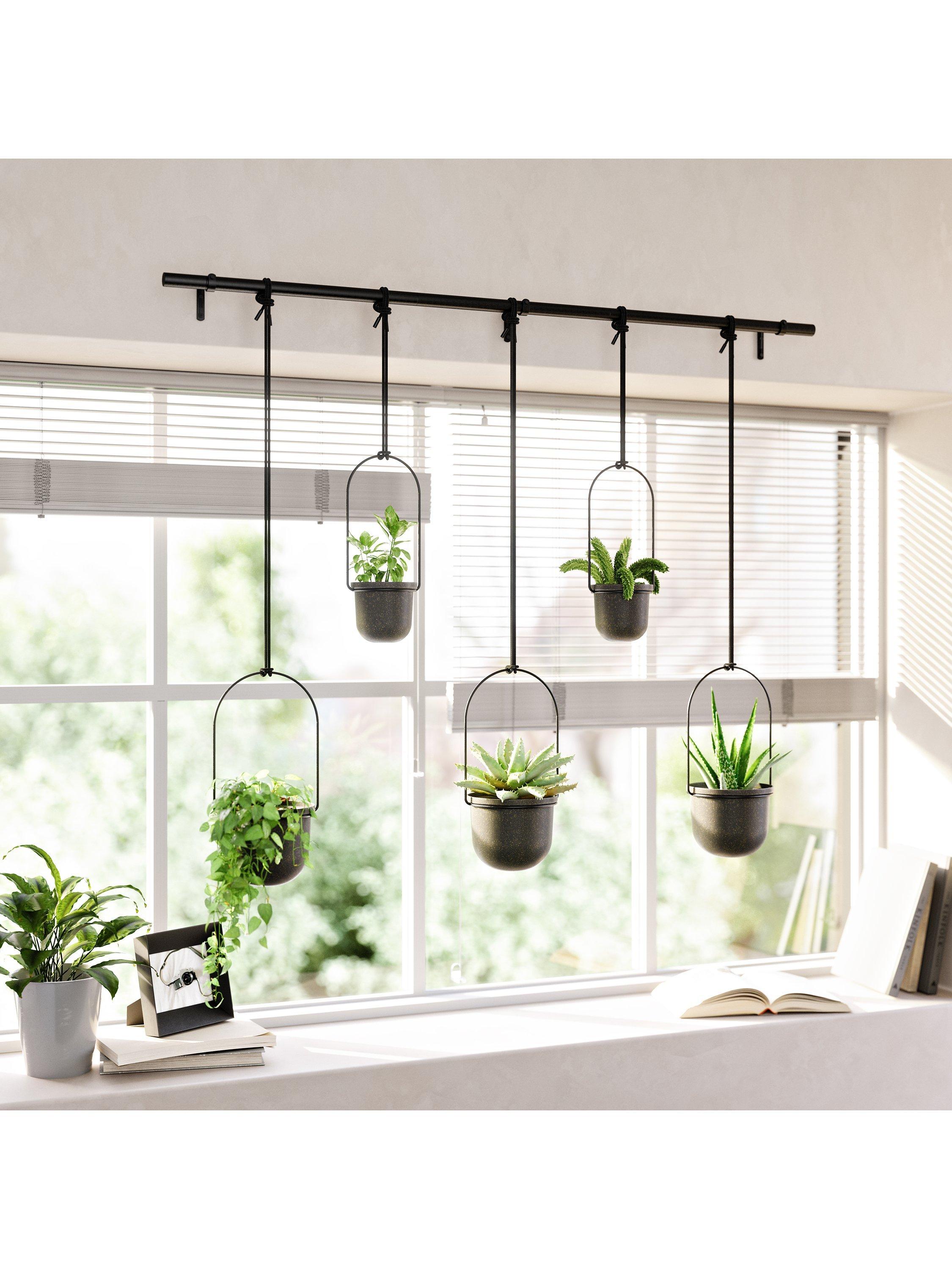This contemporary space-saving design beautifully combines a functional drapery rod with the greenery of potted plants. Mount on a wall or ceiling, perhaps above a window using the included hardware. The length of the ropes are adjustable in height and also slide along the metal rod to suit your display and space. The durable pots are lightweight and can hold two standard three-inch (7.6cm) diameter pots as well as three six-inch (15cm) diameter pots, so there's no need for re-potting.
