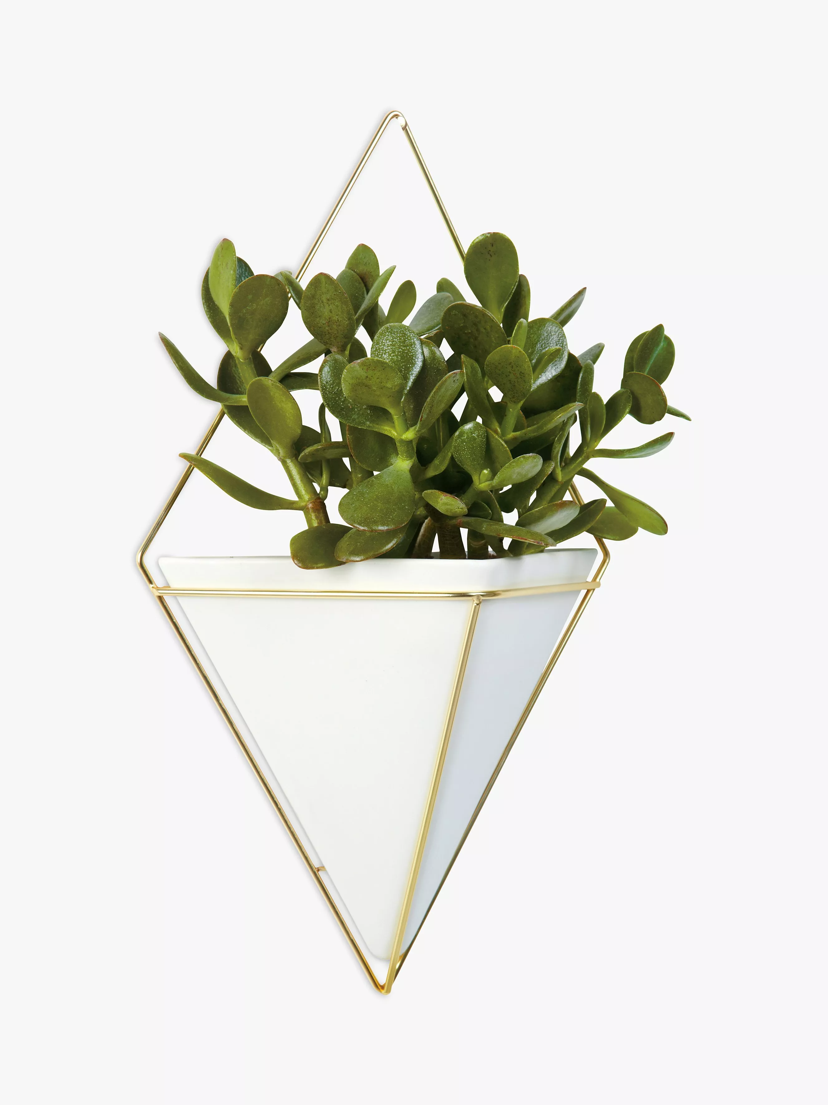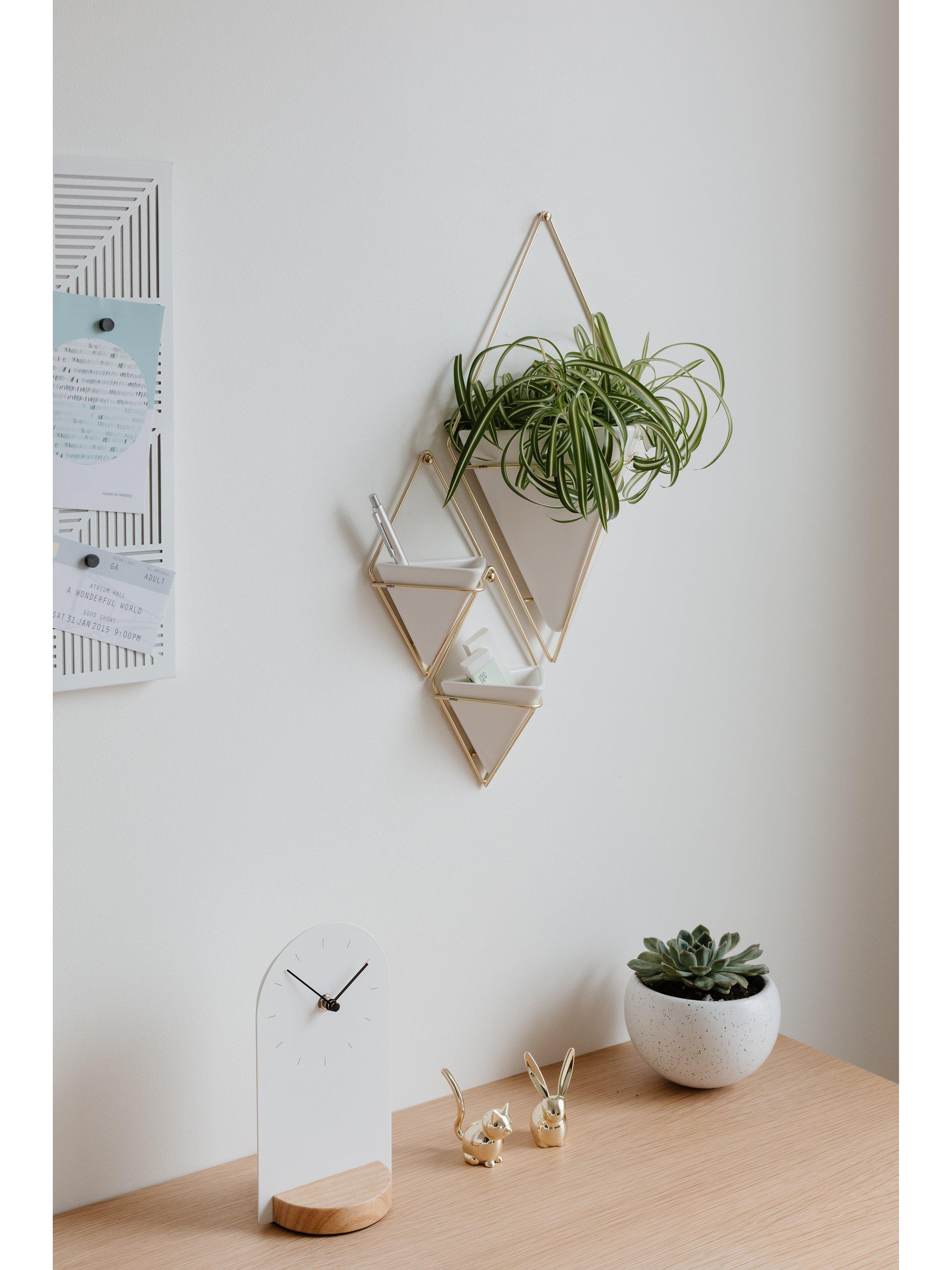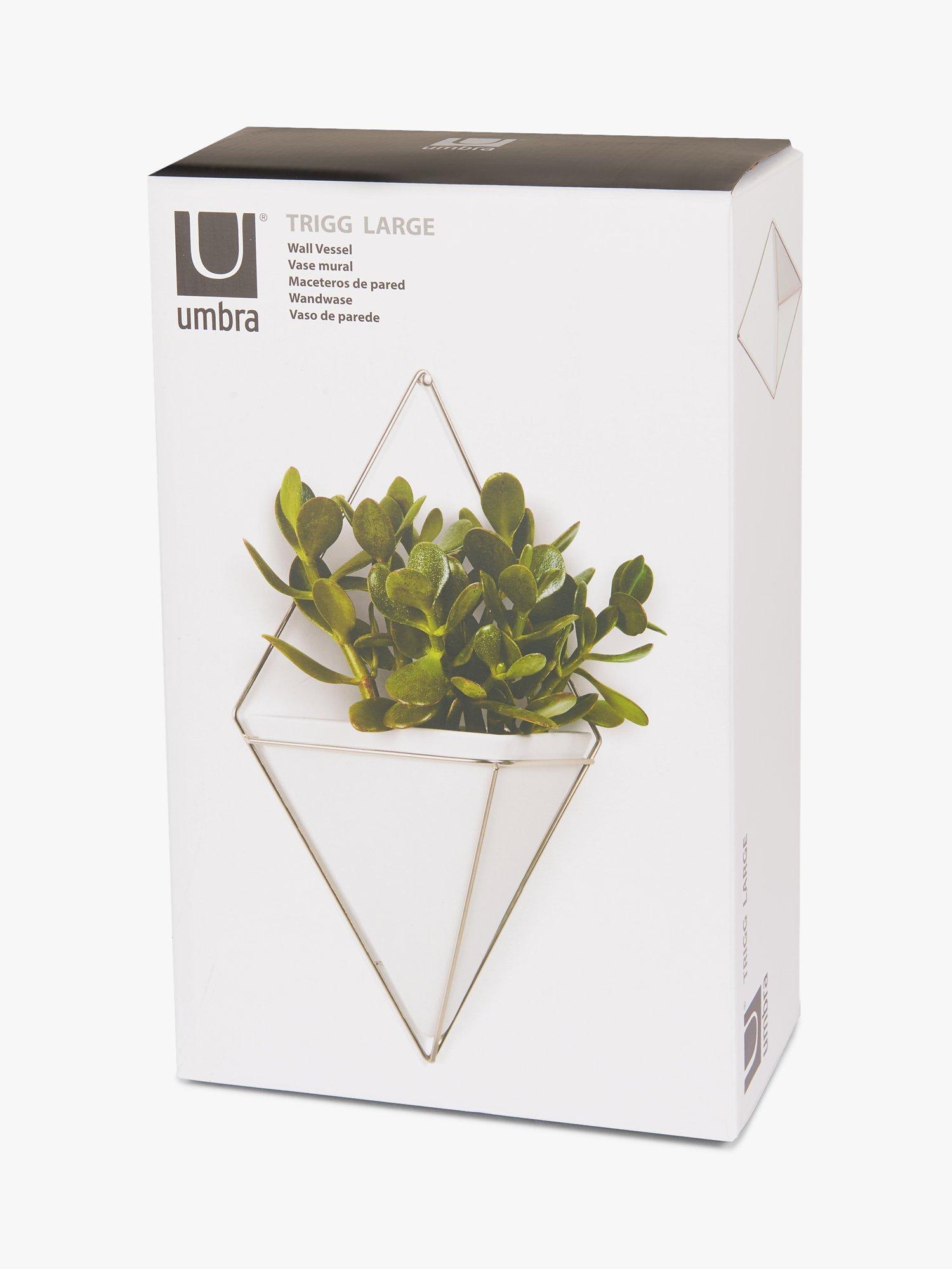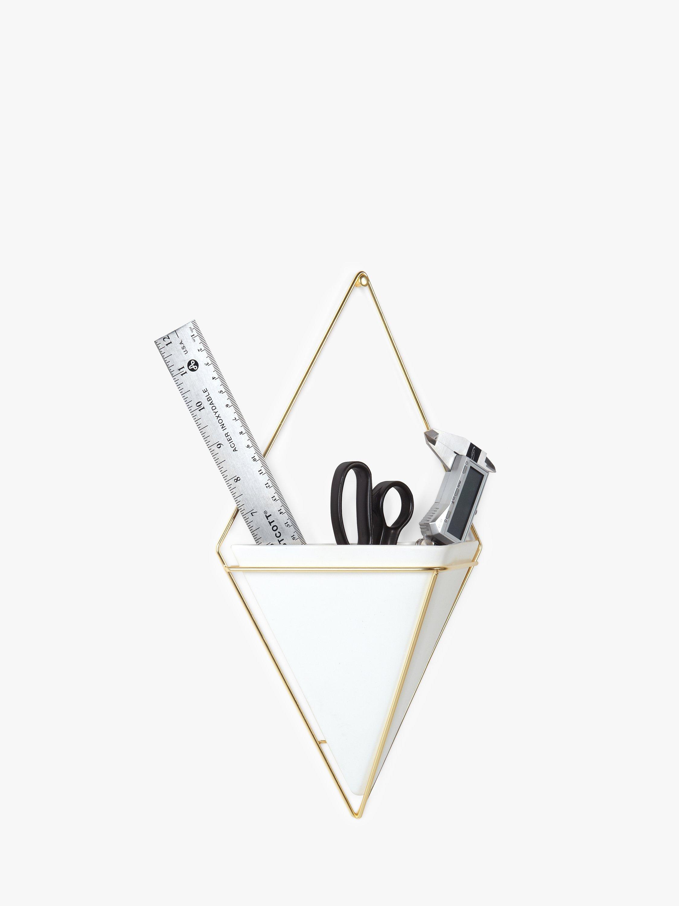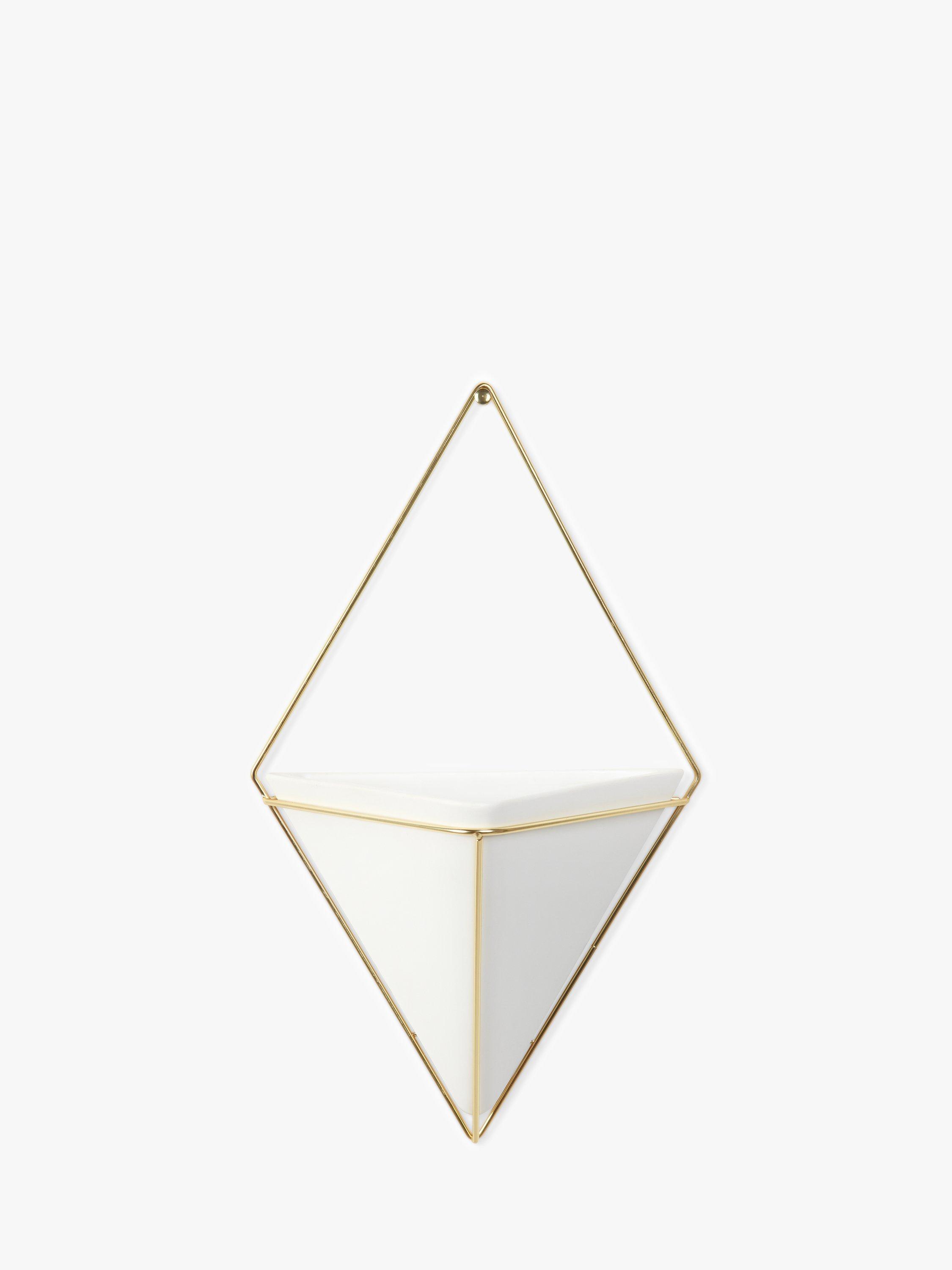 The large wall-mounted Trigg vessel from Umbra is a ceramic diamond shape held by a plated wire frame. Ideal for keeping indoor plants or as a holder for household and office items such as keys, stationery and even make-up accessories.