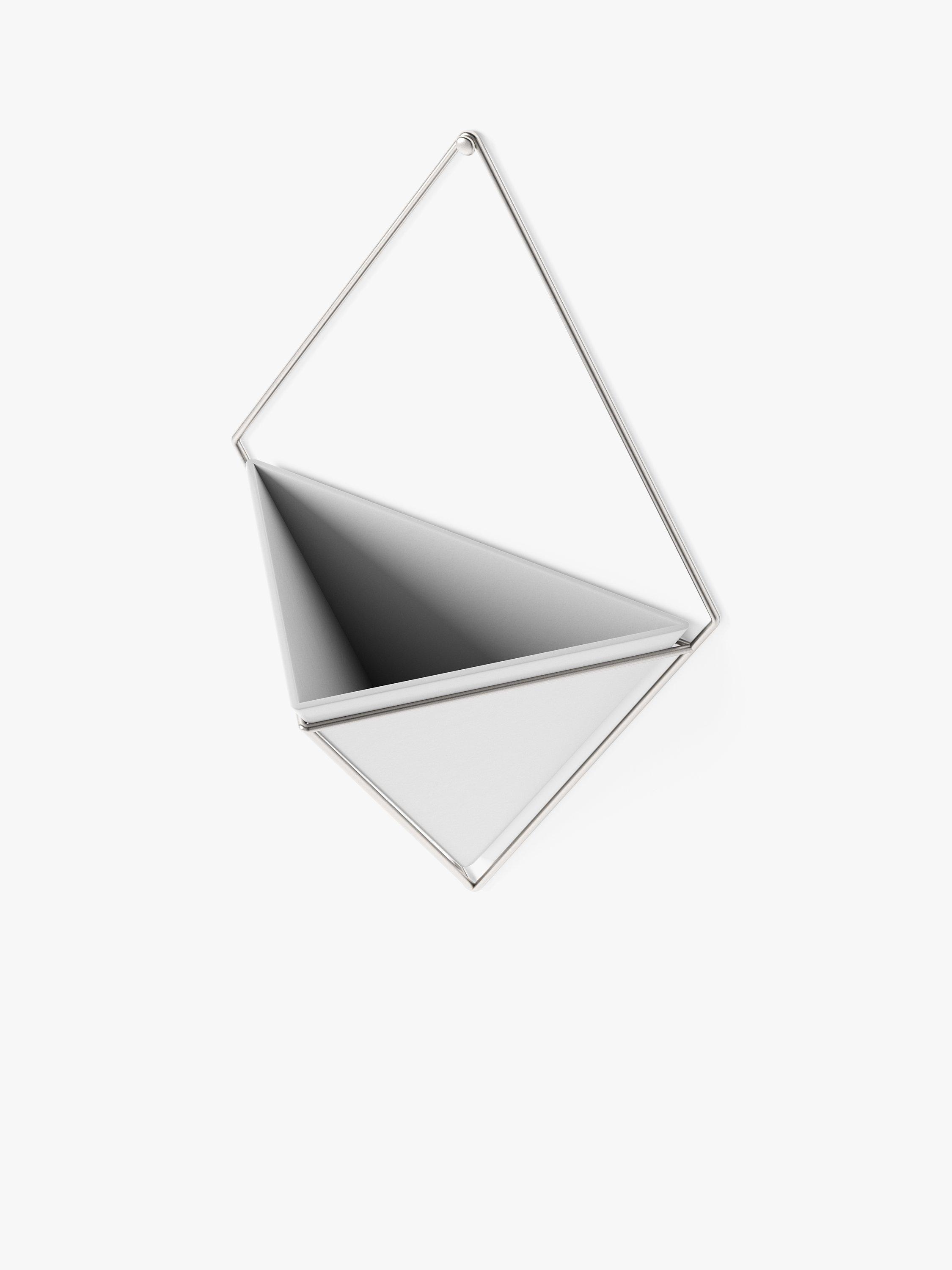 The large wall-mounted Trigg vessel from Umbra is a ceramic diamond shape held by a plated wire frame. Ideal for keeping indoor plants or as a holder for household and office items such as keys, stationery and even make-up accessories.