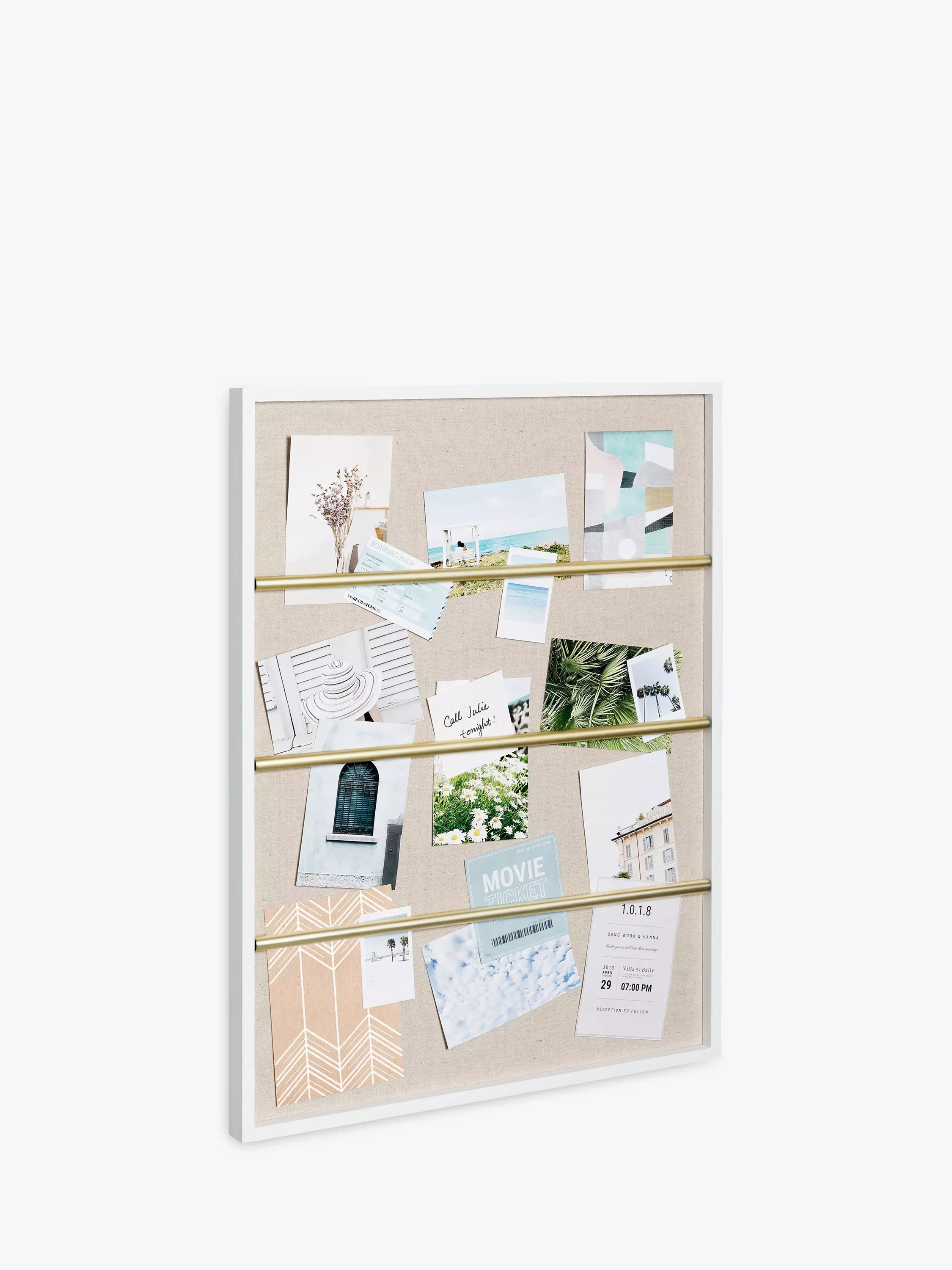 The three metal dowels keep invitations, mementos, polaroids, cards, postcards and photos all together, on a real linen background. This frame is ready to wall mount, horizontally or vertically.