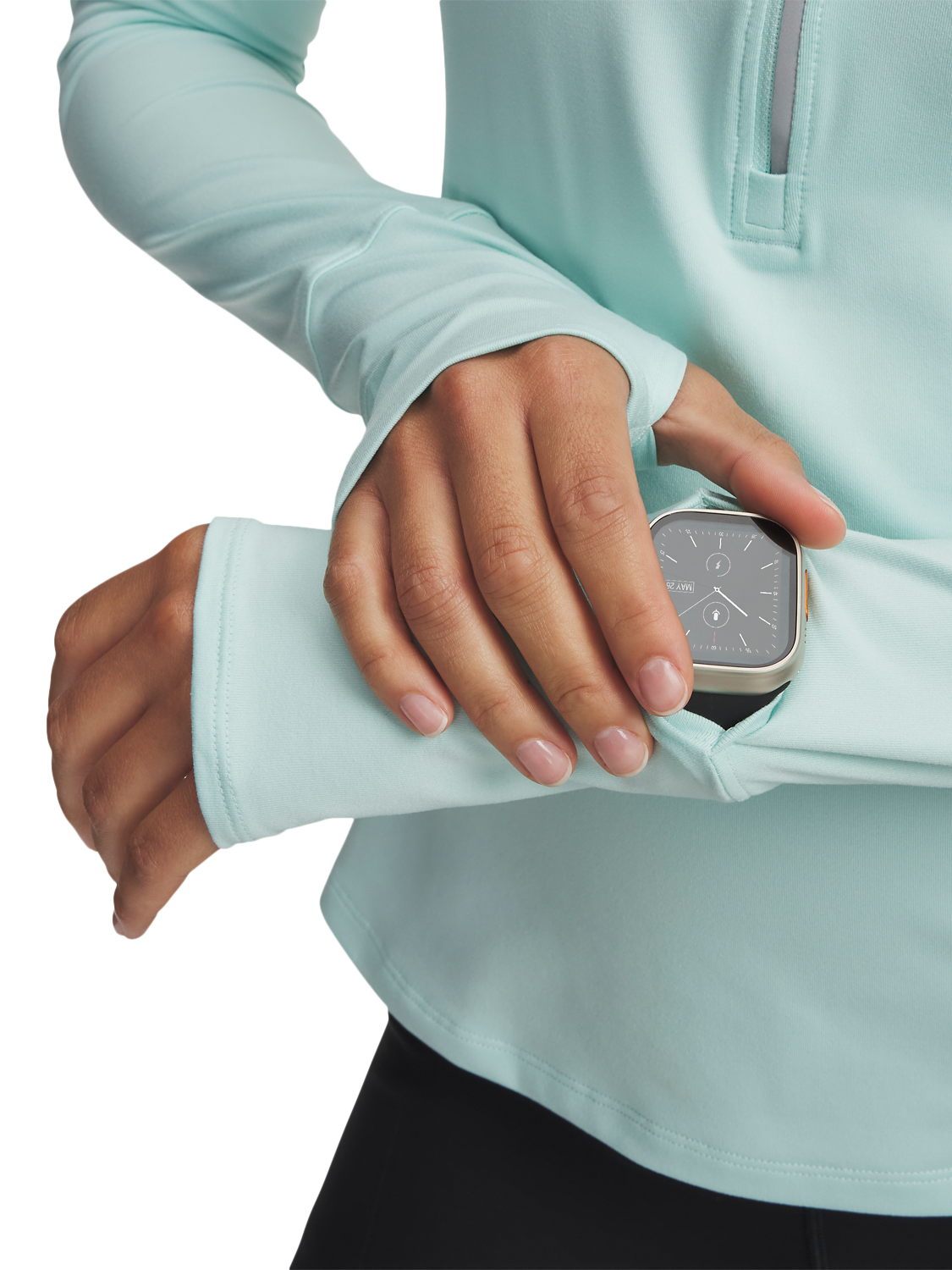 Soft knit anti-pick, anti-pill fabric has a clean, snag-free finish. Material wicks sweat and dries really fast. The 4-way stretch material moves better in every direction. Built-in thumbholes help keep sleeves in place with watch opening on the left wrist for quick and easy access. Generous zip front makes for easy layering.