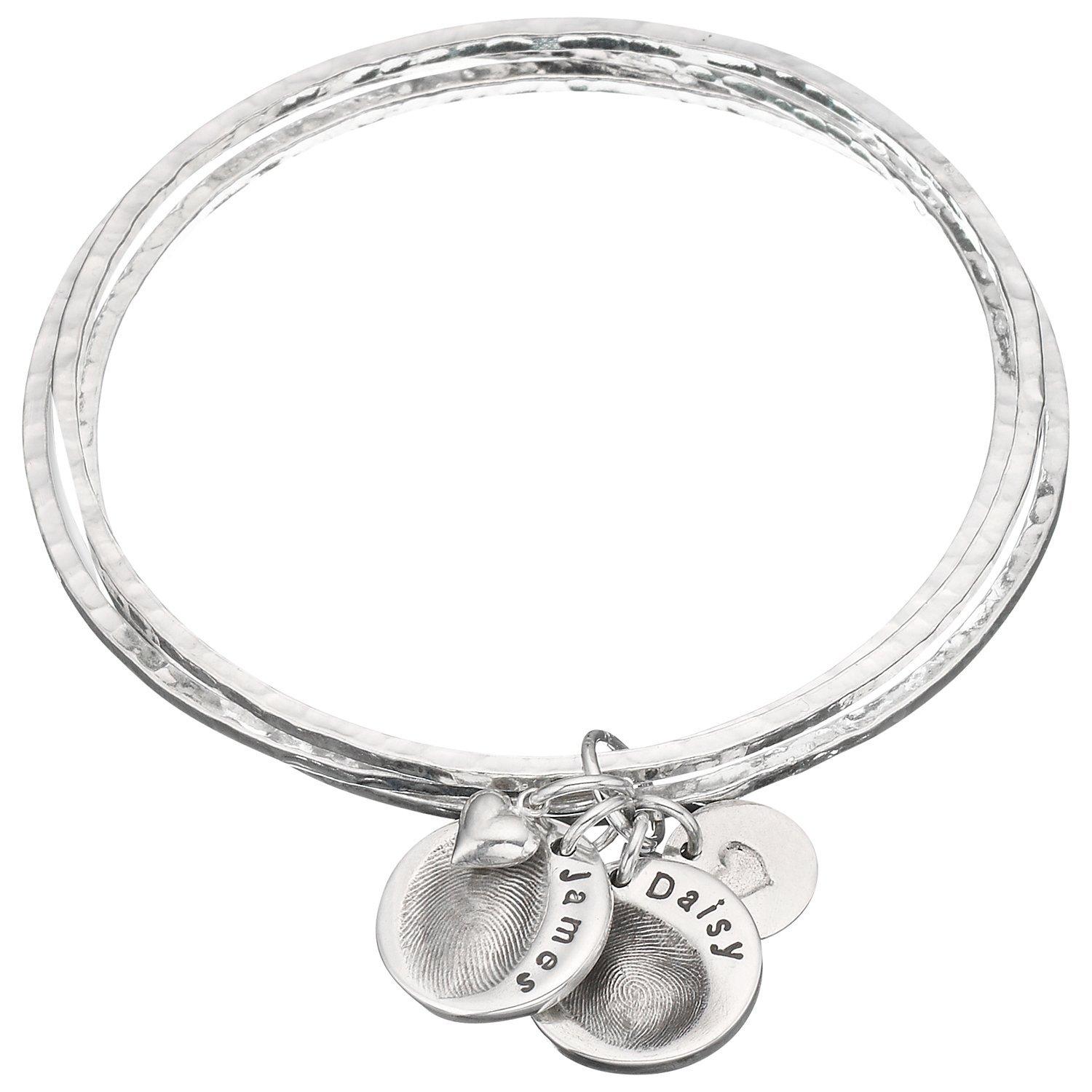 Keep the ones you love close to you wherever you are with this special personalised bracelet. It features 3 sterling silver hammered bangles decorated with 2 round charm imprinted with a fingerprint of your choice and personalised with a name or initials.