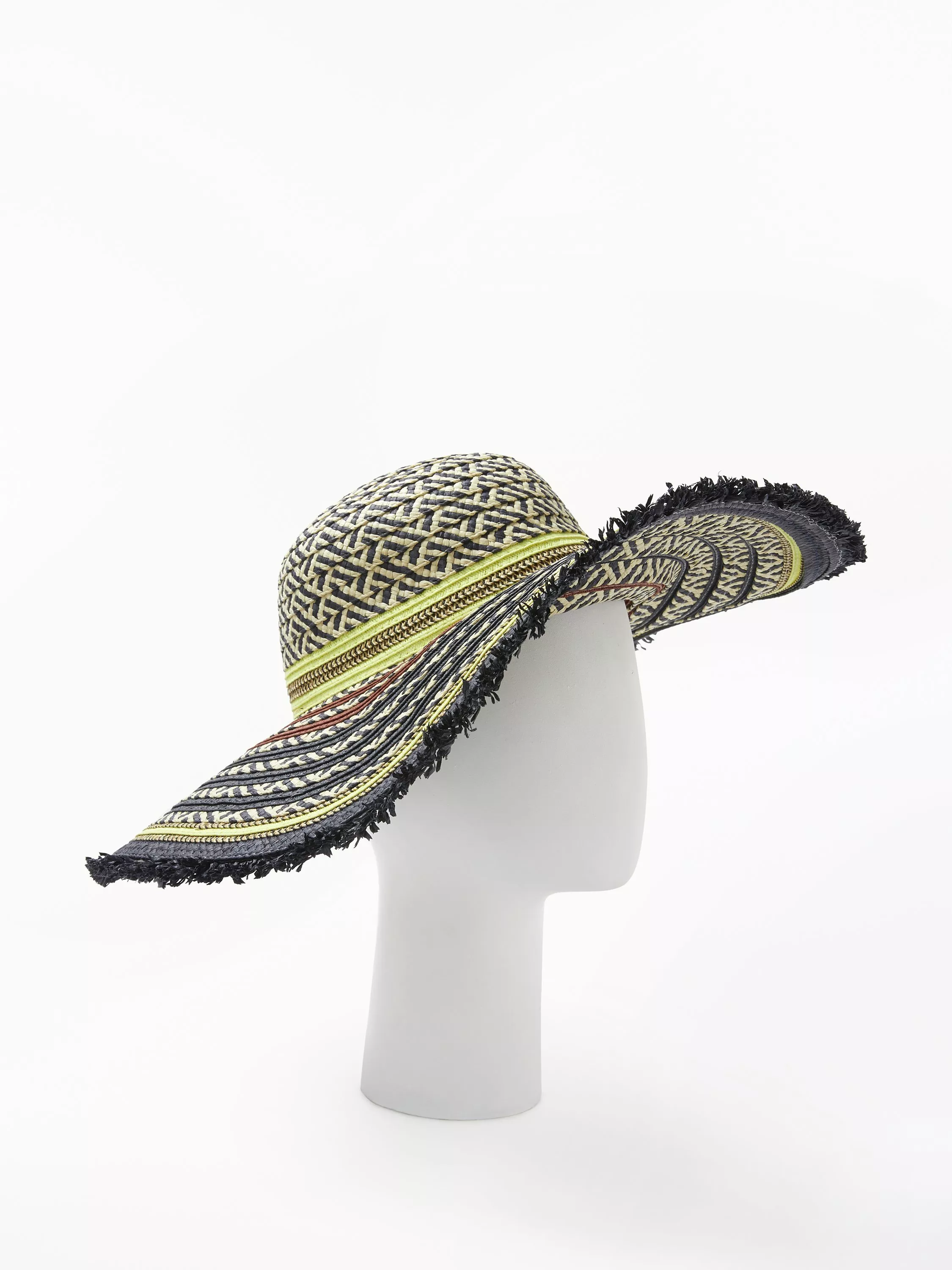 Made from braided paper, the hat will protect you from the direct and hot sunlight in style. The hat is complemented with hints of bright yellow and fringed edges.