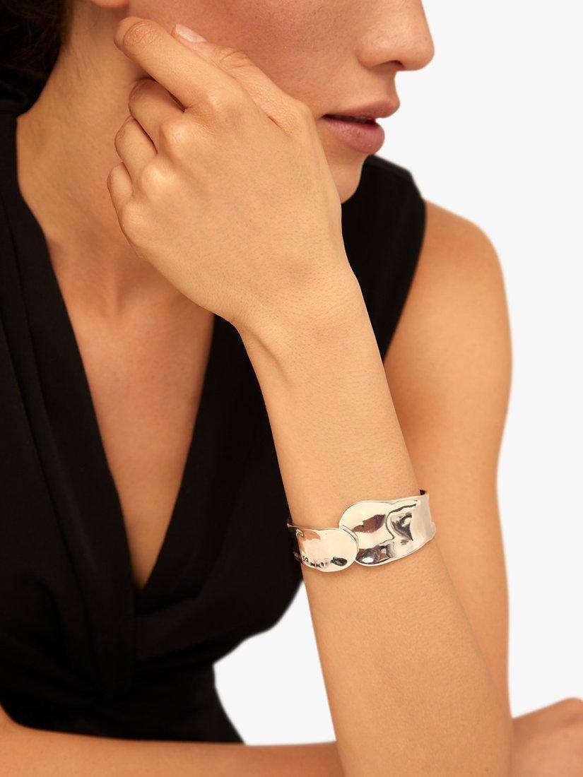 A rigid bracelet in the original form of superimposed waves. This jewel is inspired by big ships that sail on a long journey in search of treasures. The style is made in Spain by UNOde50 and ela.