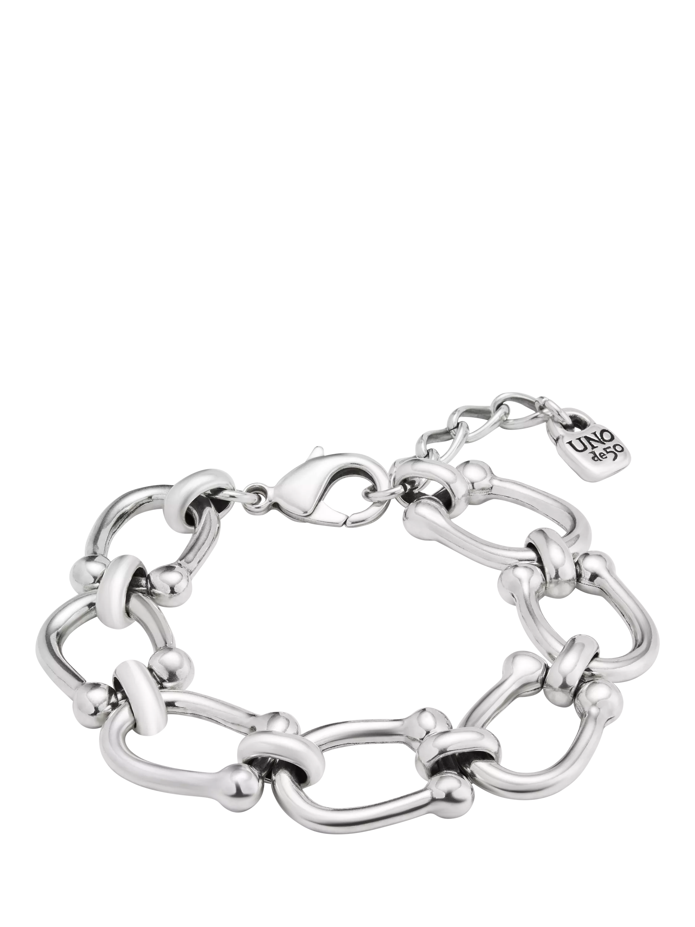 A modern style that can be worn at any time or situation, this chain bracelet uses polished horse-shoe shape links for a statement look. The style is adjustable in length for the perfect fit.