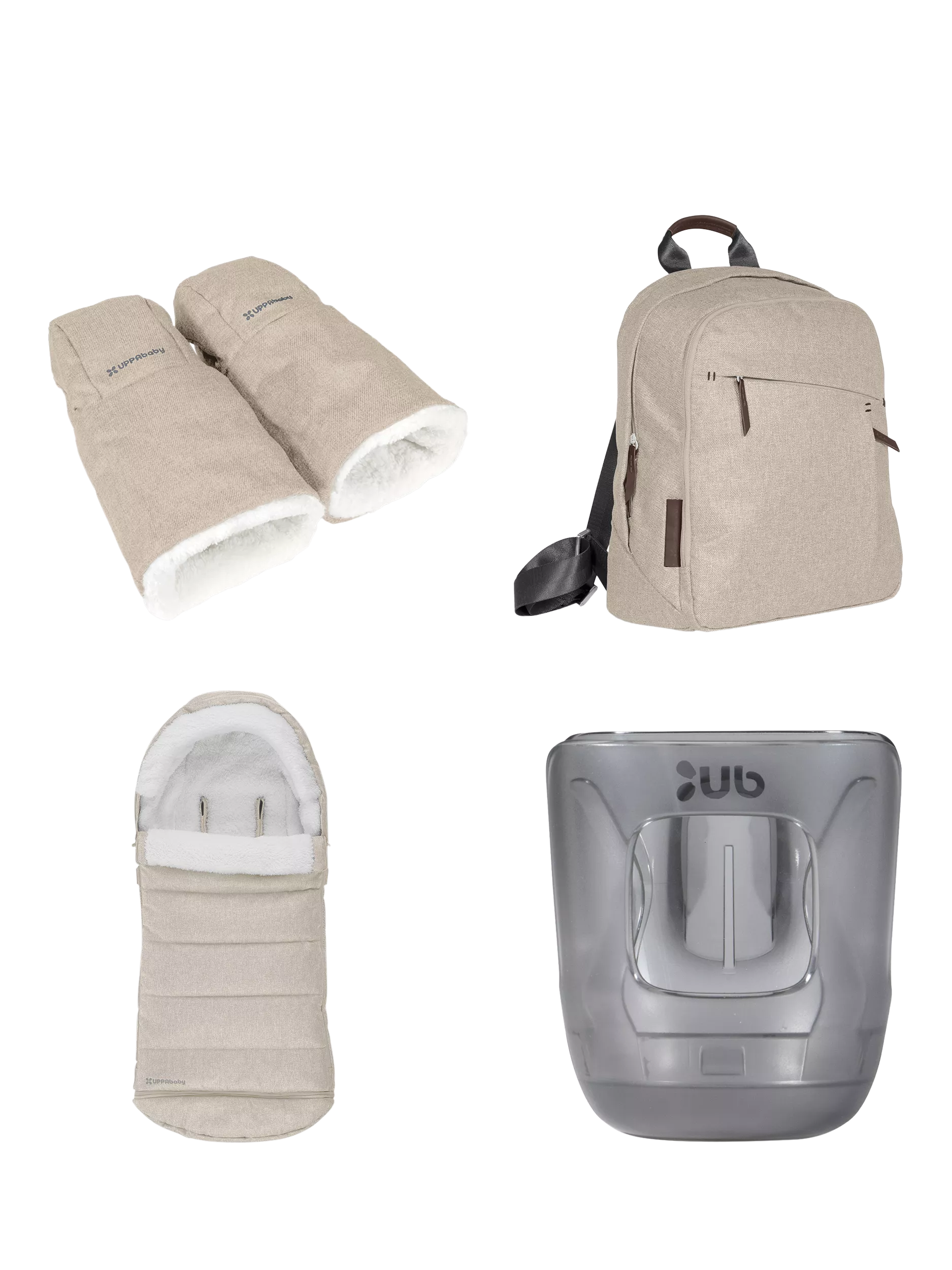 This 4 piece accessory pack comes with a footmuff, a cup holder, a changing bag and a pram glove.