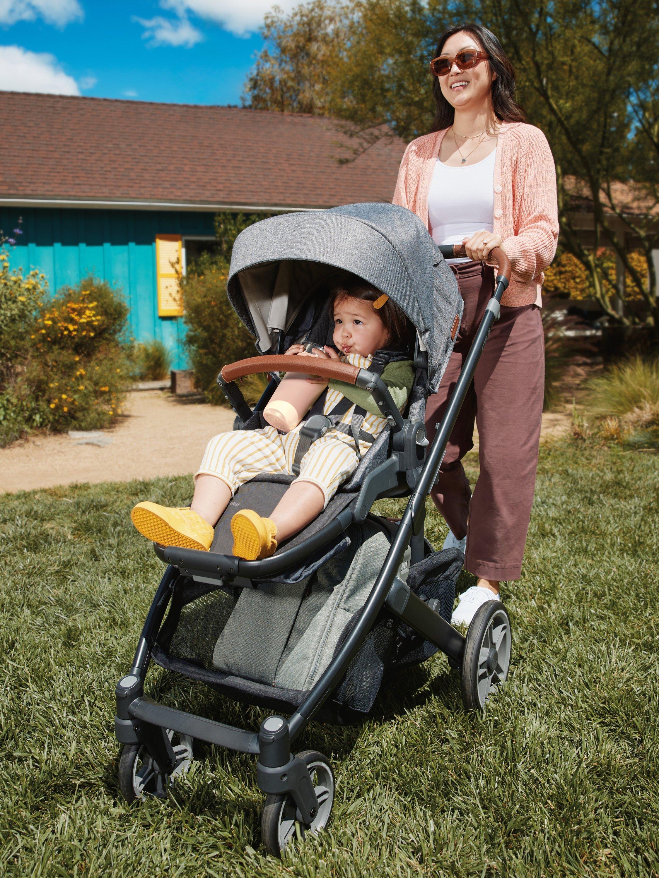 The UPPAbaby CRUZ V3 offers a from-birth solution without the need for an additional carry cot. It has a deep-sided seat with a removable inlay that can be used from birth, and the rear suspension is designed to adapt to the weight of your child, offering comfort for both newborn babies and toddlers. The no-rethread adjustable harness is also designed to adapt to a growing child and has a magnetic buckle for quick attachment. It also features an extendable hood that provides shade and is supplemented with an additional roll-out UPF50 shade, which stows away in the hood when not required. Further features include one-hand backrest and footrest operation and a real leather adjustable height handle bar and bumper bar. It can be fitted with the UPPAbaby carrycot and is travel system compatible with approved infant carriers.