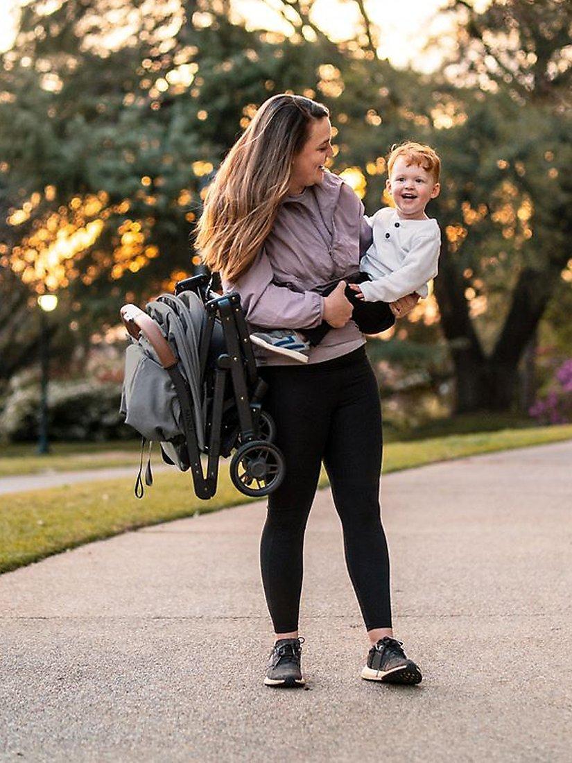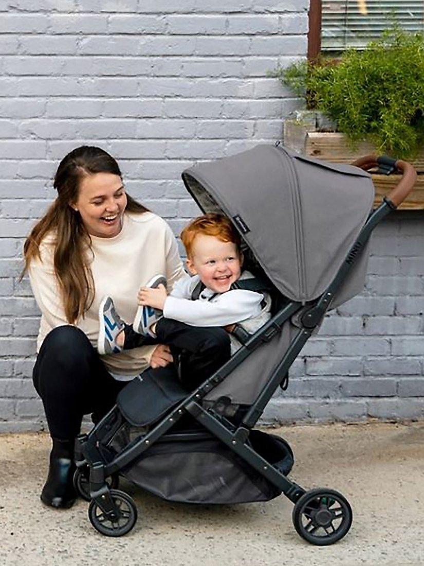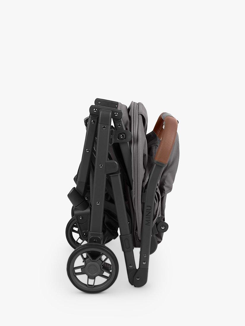 At only 52 cm wide and 7.6kg weight (as a stroller), the MINU is an ideal compact city pushchair, or with accessories a pram with carry cot or travel system. The one hand compact fold with a shoulder strap allows for hands free carrying so you can take it anywhere. It's compact fold and lightweight makes it suitable for carry on with some airlines (please check before flying).