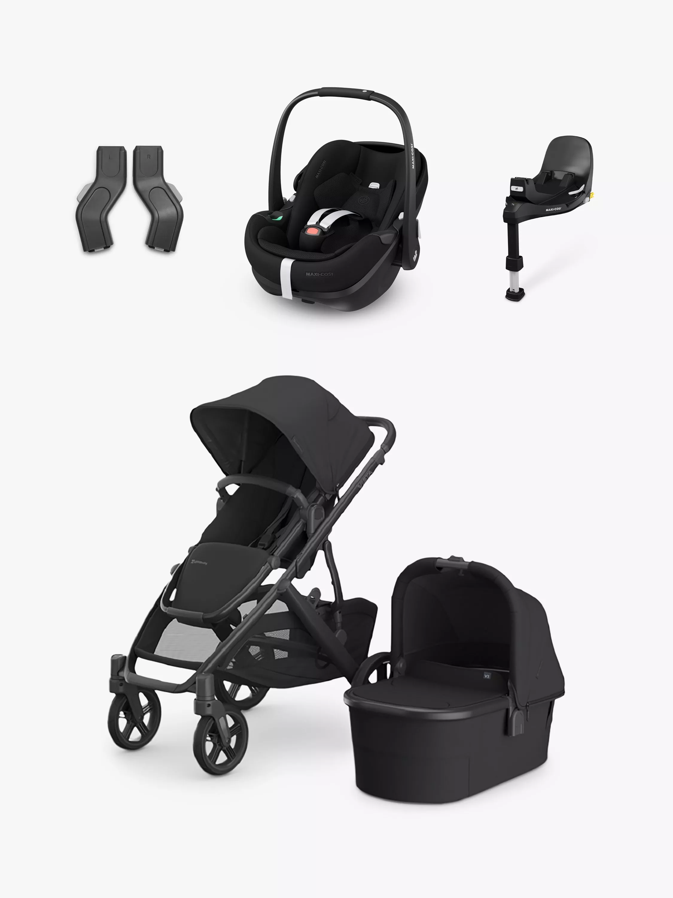 One and done - this bundle takes the guesswork out of travel system compatibility. The bundle comes with the UPPAbaby Vista V3 Pushchair and carrycot, the compatible Maxi-Cosi Pebble 360 Pro2 car seat, the FamilyFix 360 base, and the relevant adaptors.