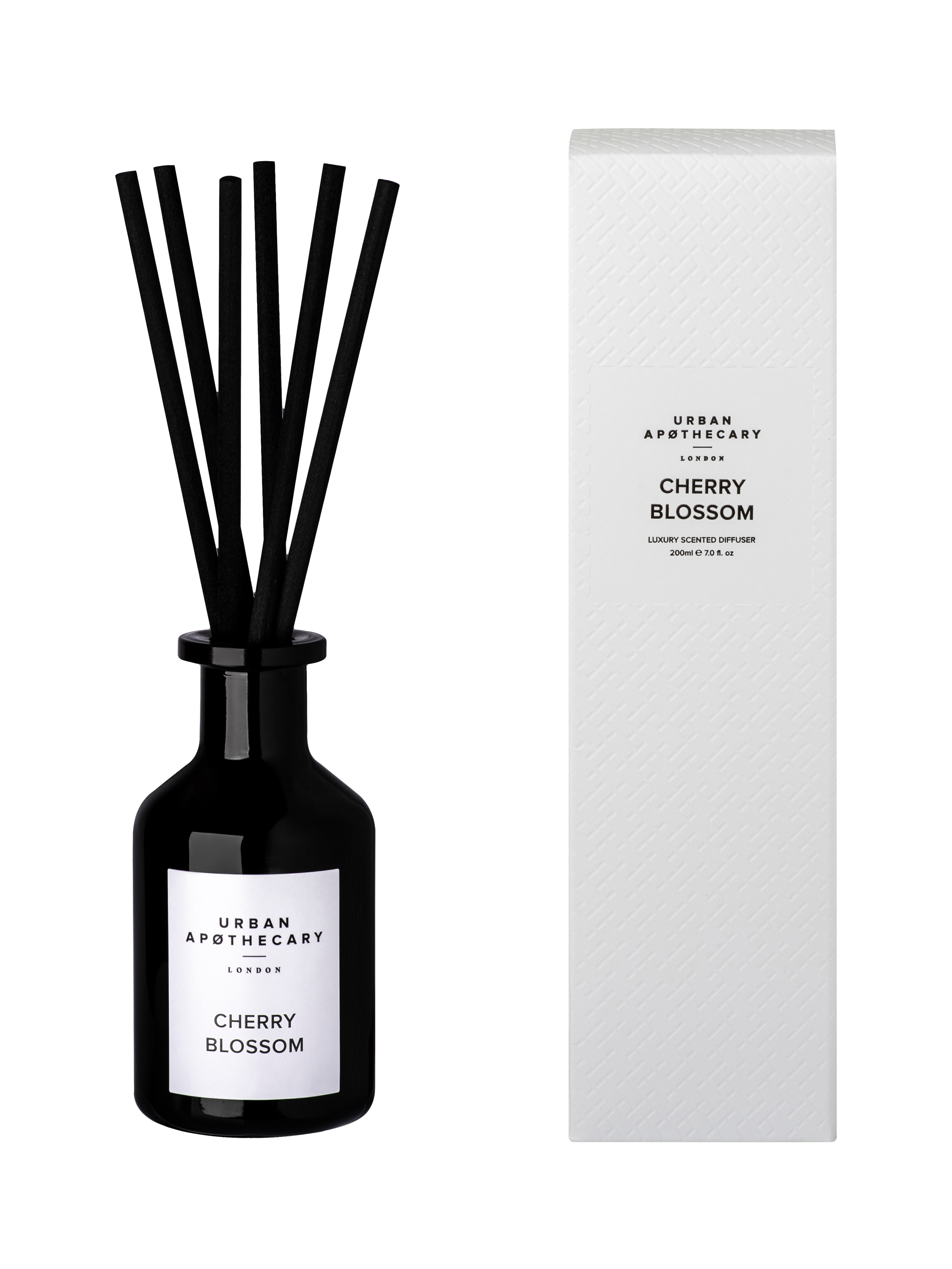 This smart Cherry Blossom signature diffuser is hand-poured by artisans in Urban Apothecary's Leicestershire candle factory. The luxurious glass apothecary bottle with diffuser fragrance is accompanied by six reeds. The rich, captivating aroma of Cherry Blossom will infuse rooms with continuous scent for up to 12 weeks.