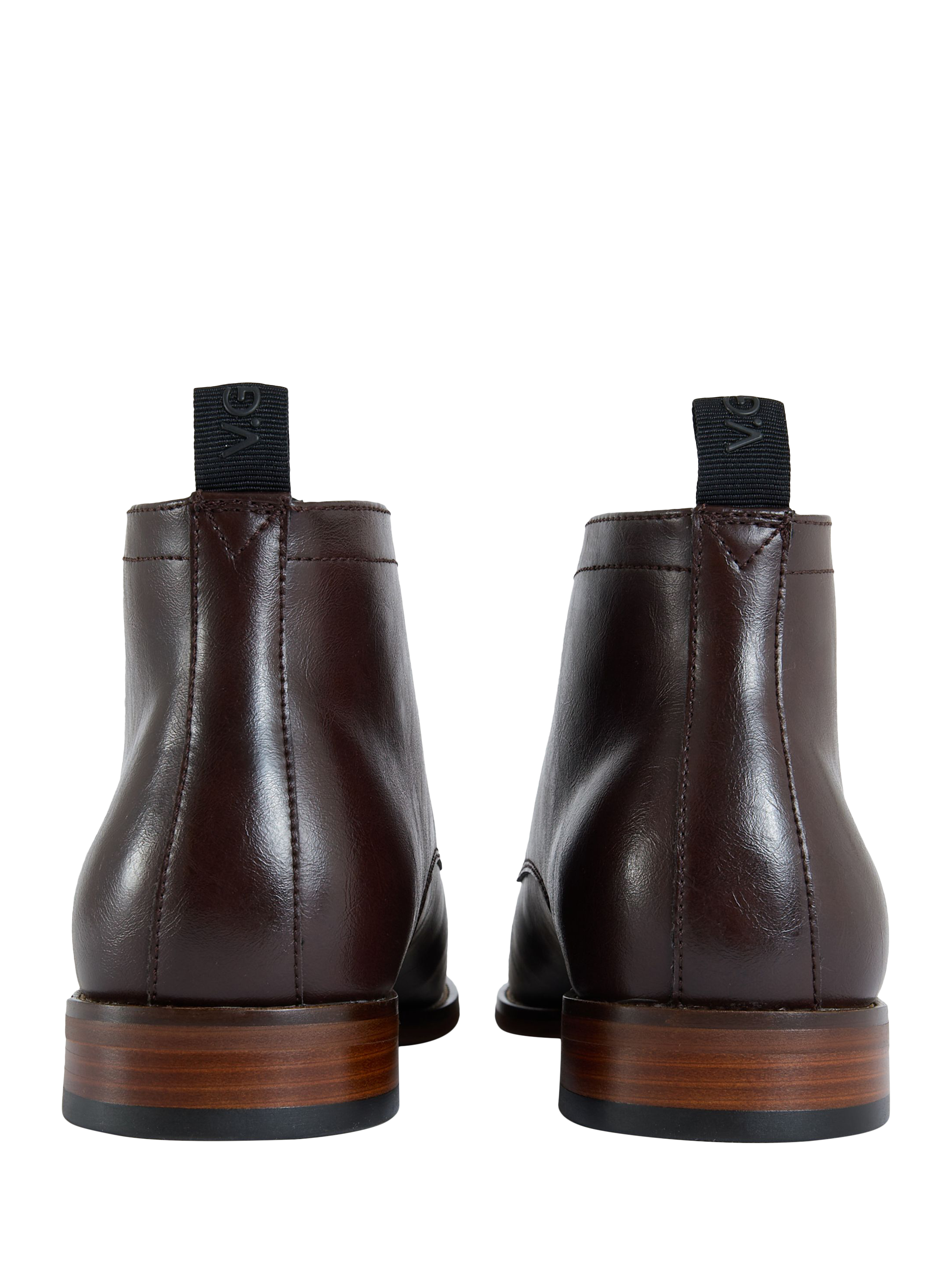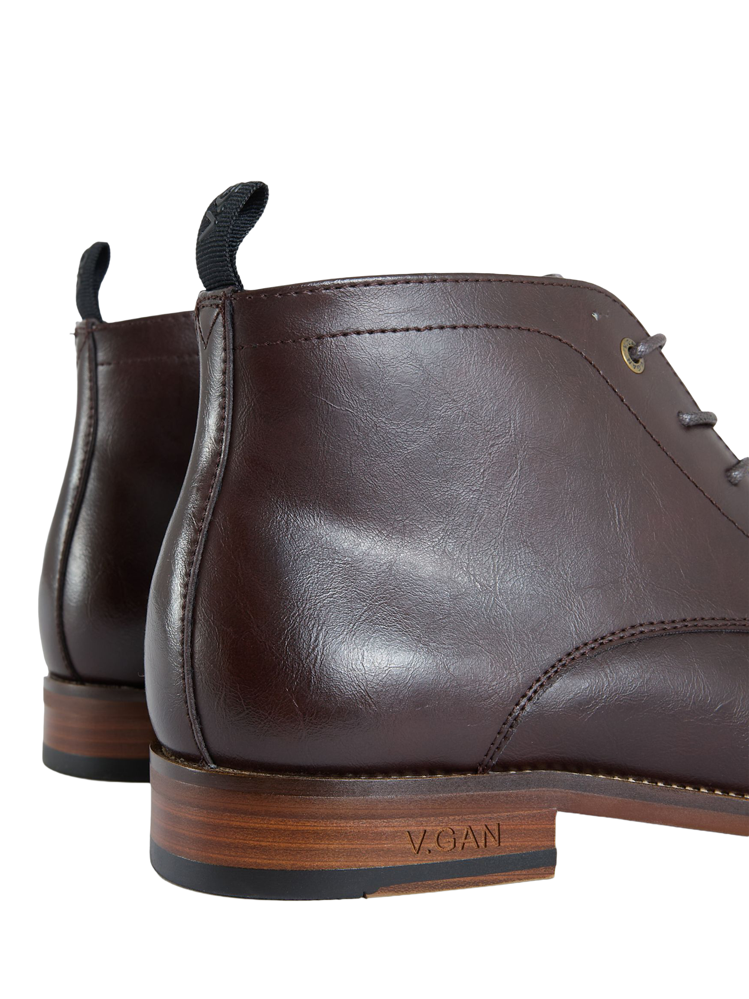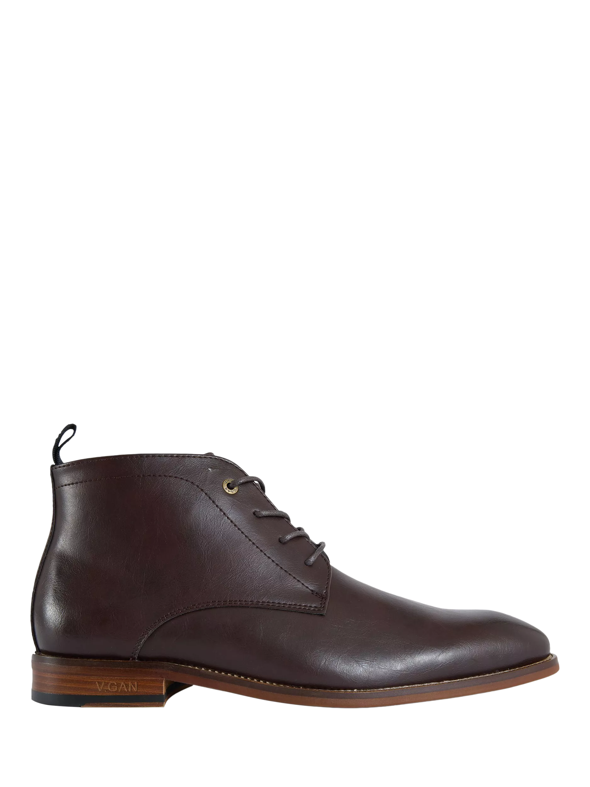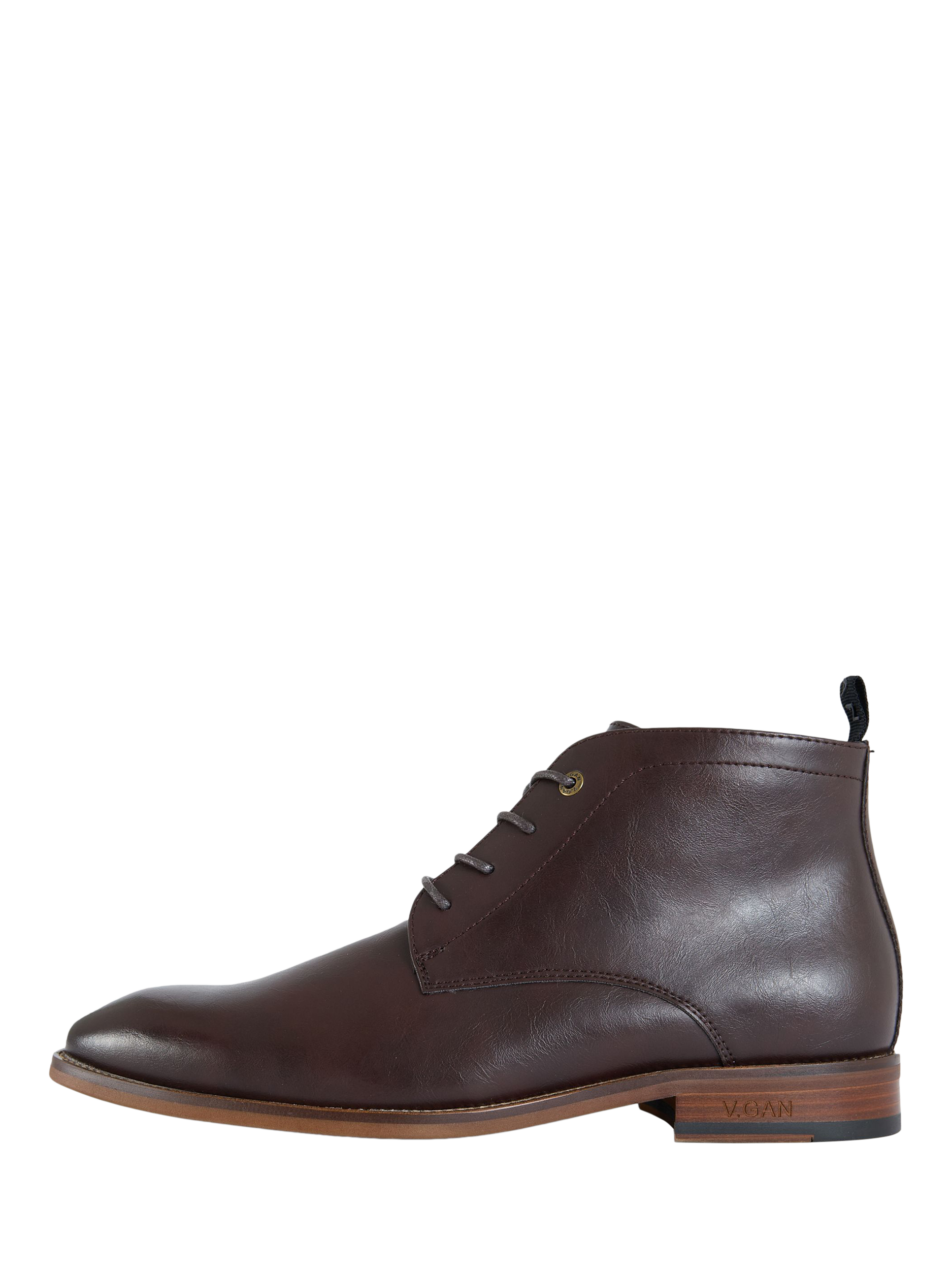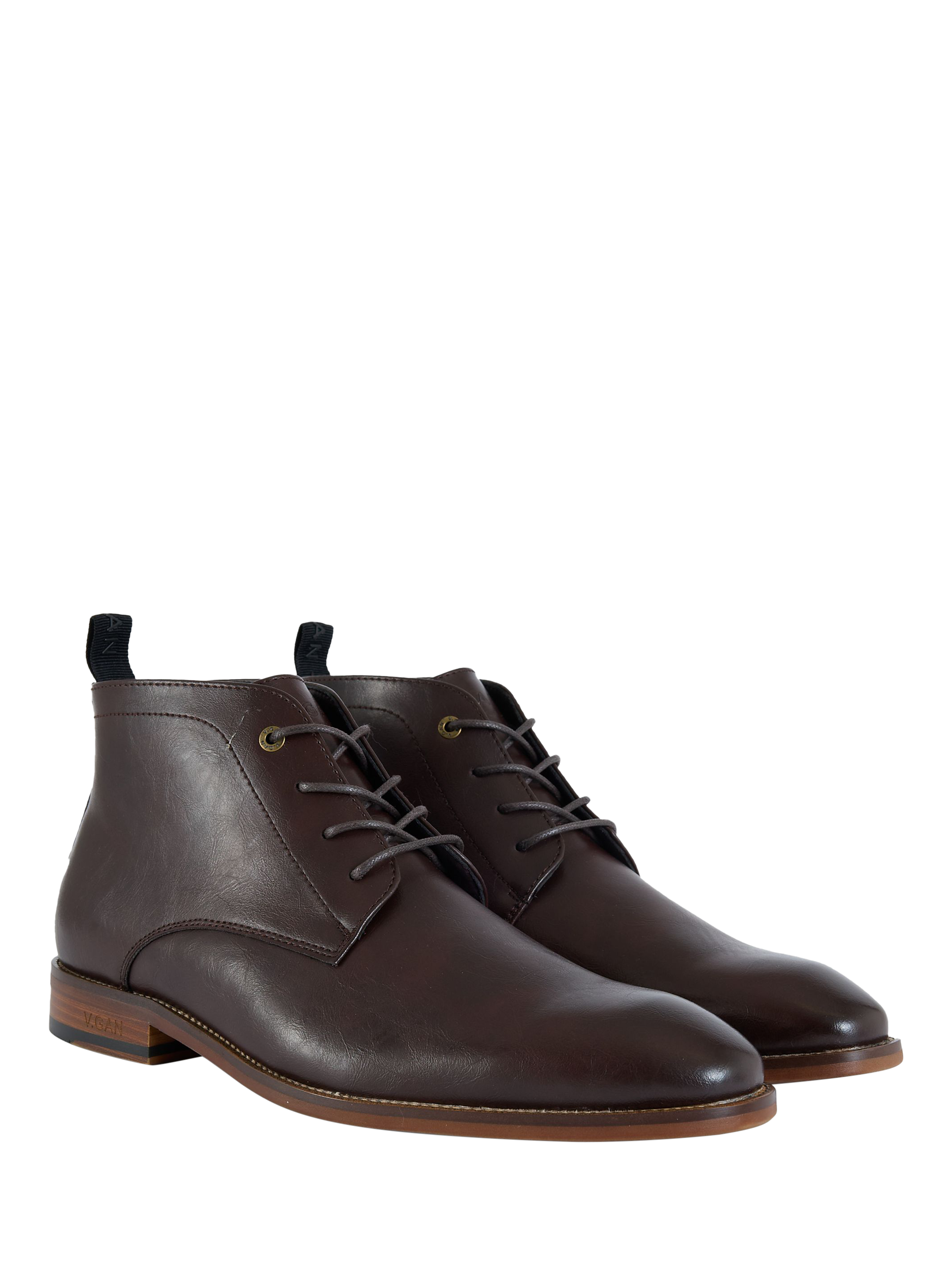 Lace-up chukka boots in faux leather from the V.GAN COFFEE group collection. Designed for comfort, durability and style. Finished with V.GAN branding etched into the wood-effect heel.