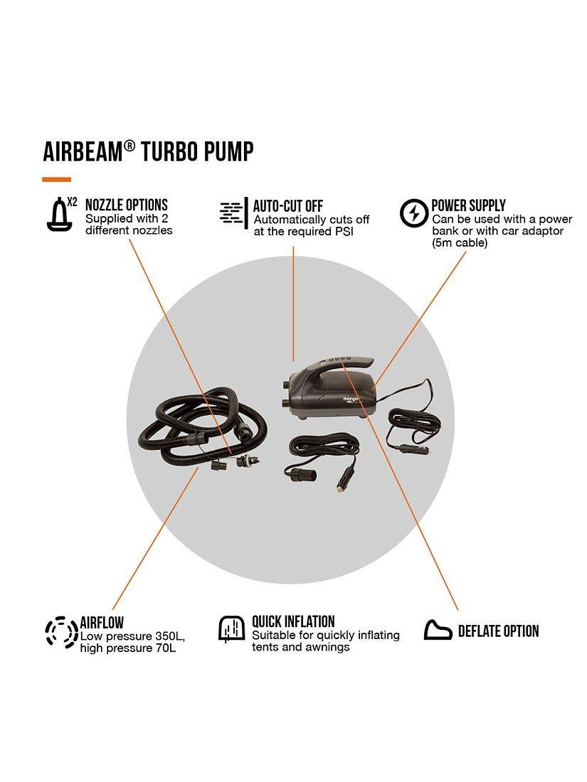 Introducing the AirBeam Turbo Pump, Vango's most powerful pump, ensuring quick and easy pitching. The motor has been designed for quick inflation, especially when used on the brand's Single Point Inflation tents and awnings.