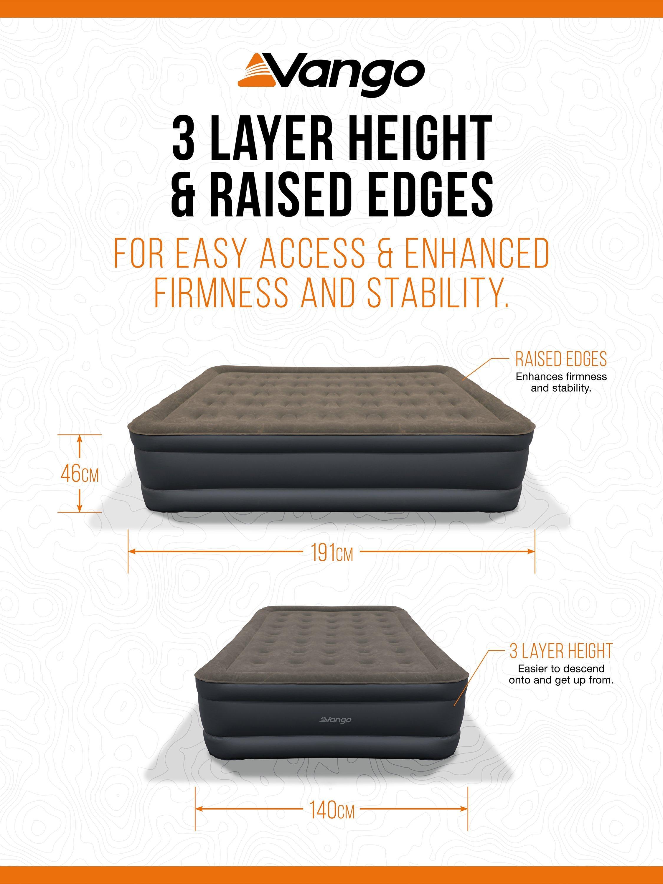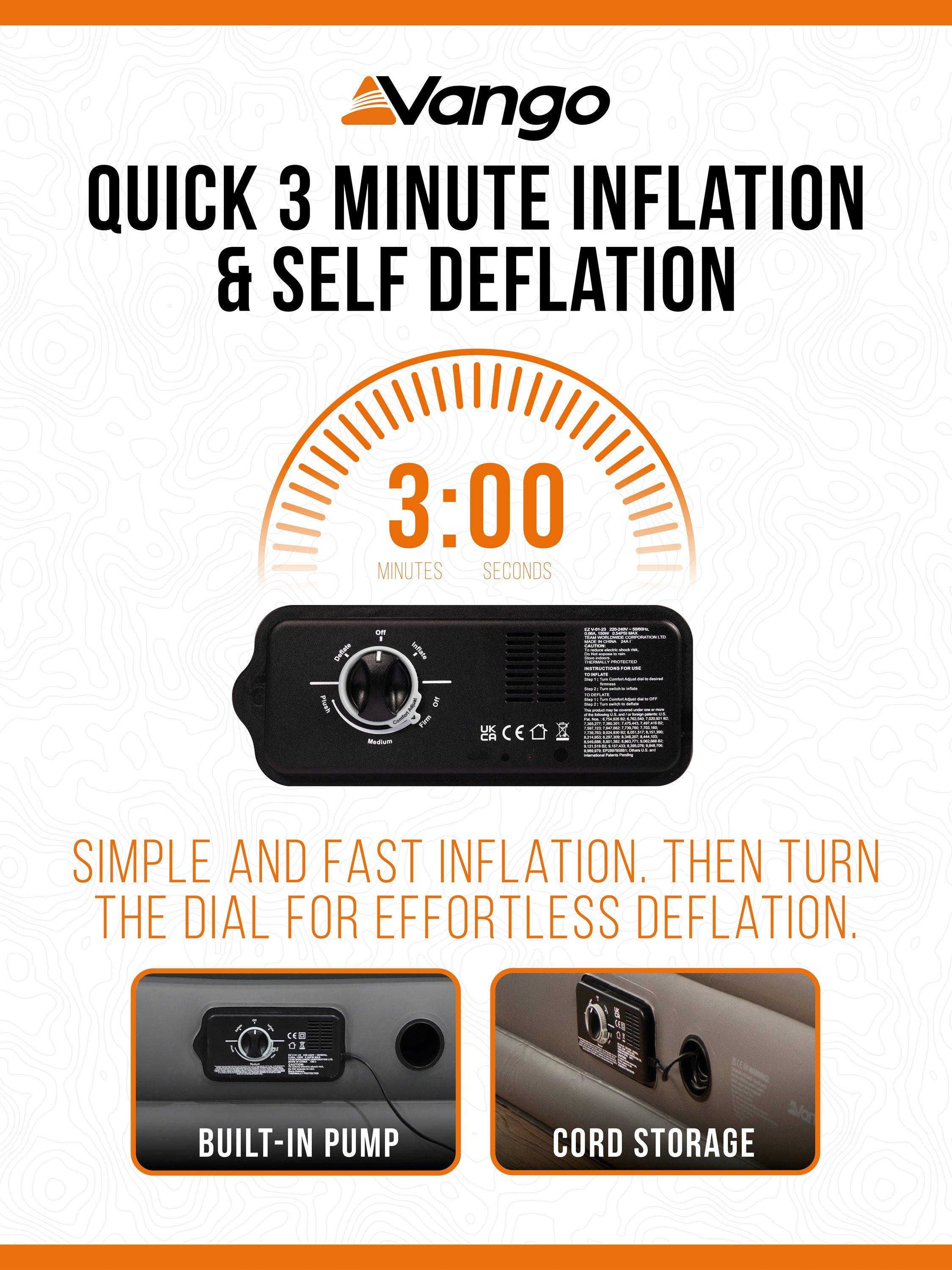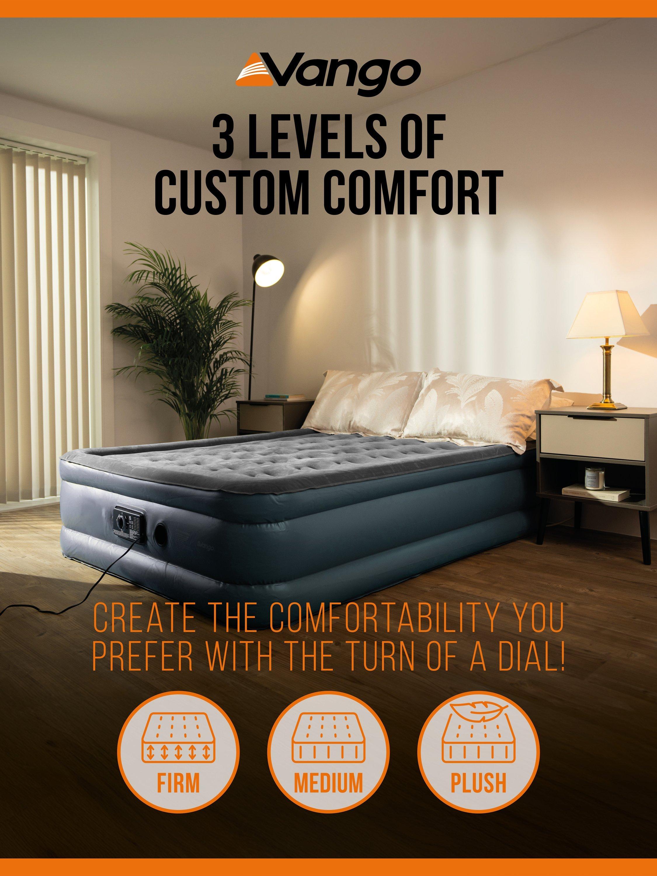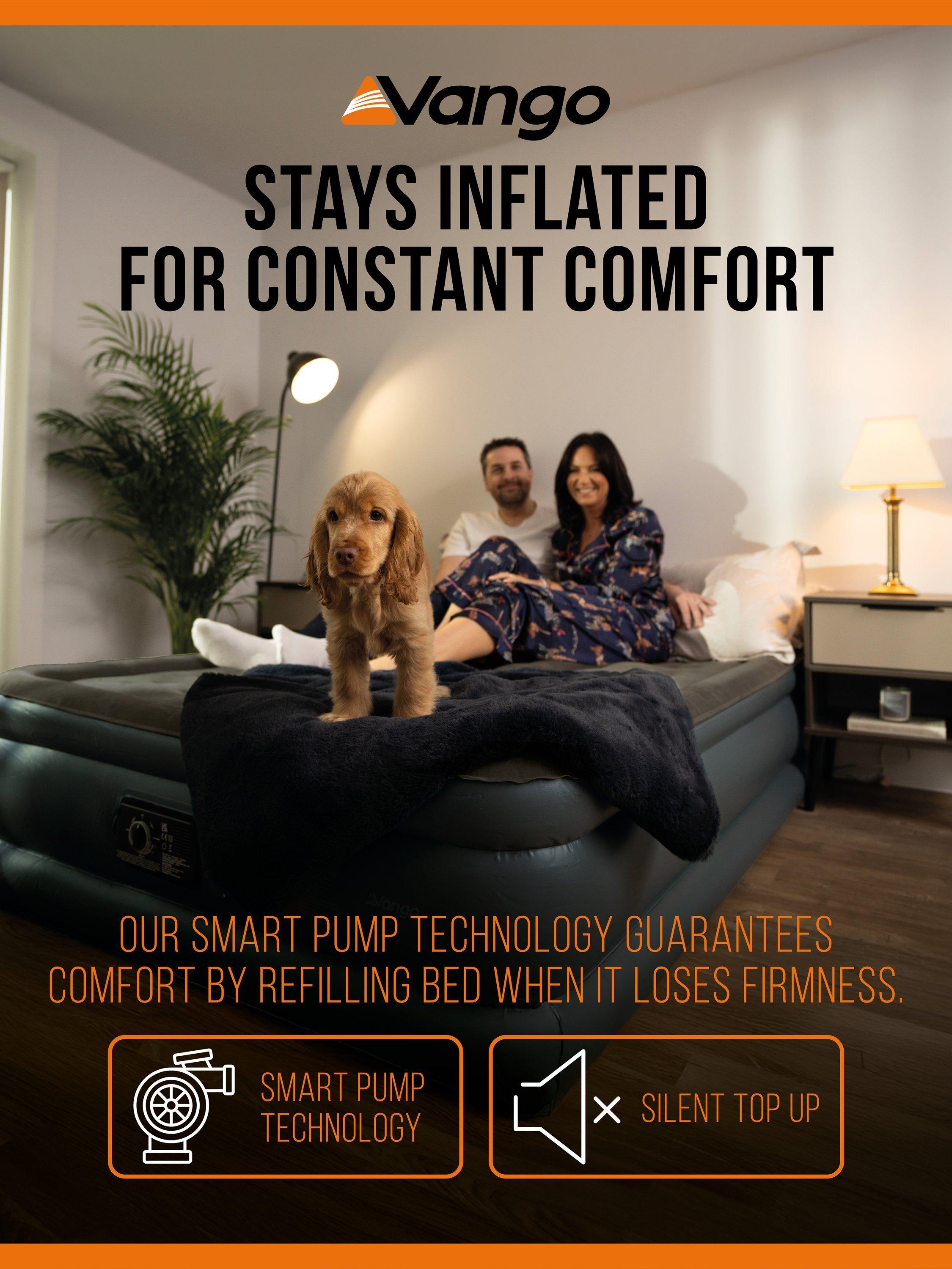 Enjoy the comfort and ease of the top of the range Vango Blissful Double Airbed. The Blissful allows you to adjust the firmness of the bed to three comfort settings. You will also have peace of mind that it will not deflate in the night with the silent built in pump, which intelligently detects any loss of air pressure and self inflates. The Blissful has an indulgent soft surface and elevated height for added comfort, perfect for campers who desire uninterrupted sleep.