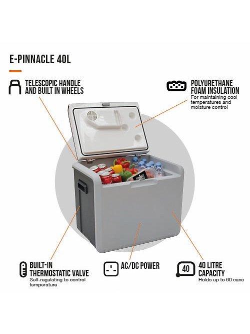 The Vango E-Pinnacle 40 Litre Electric Coolbox can be powered either from AC -230V mains or by a DC - 12V in-car socket. This thermoelectric coolbox is able to cool up to 16°C below the ambient temperature ensuring that your food and drink supplies are kept cool even on a warm day. Telescopic handle and sturdy wheels make it easy to manoeuvre, while two removable dividers for food and beverage storage makes it perfect for all occasions.