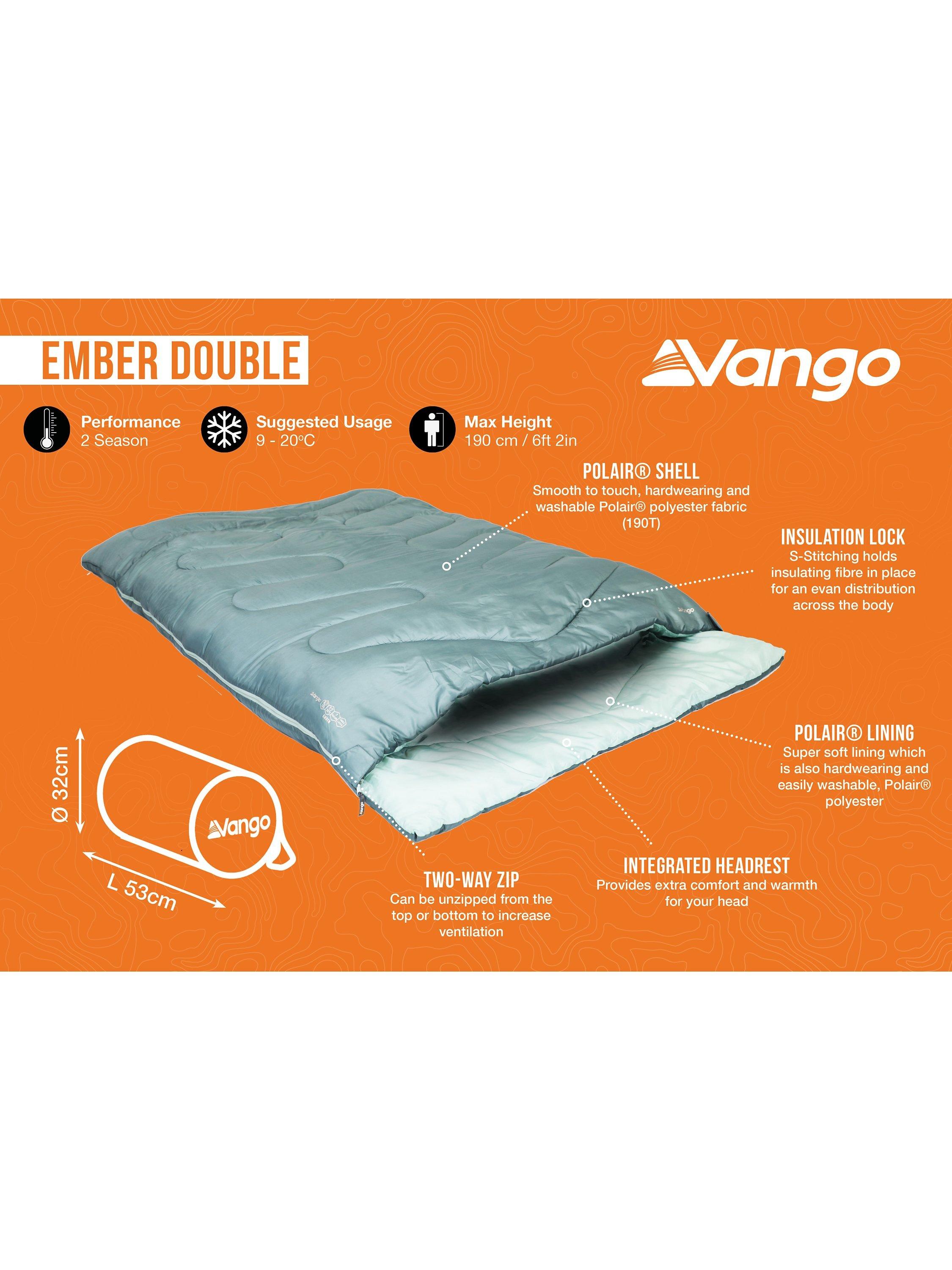 Part of the Vango Experience collection, the Ember Double is a 2-season bag constructed using quality fabrics and fills, combined with a small price tag, making it the ideal purchase for cost-conscious family campers and festival-goers.