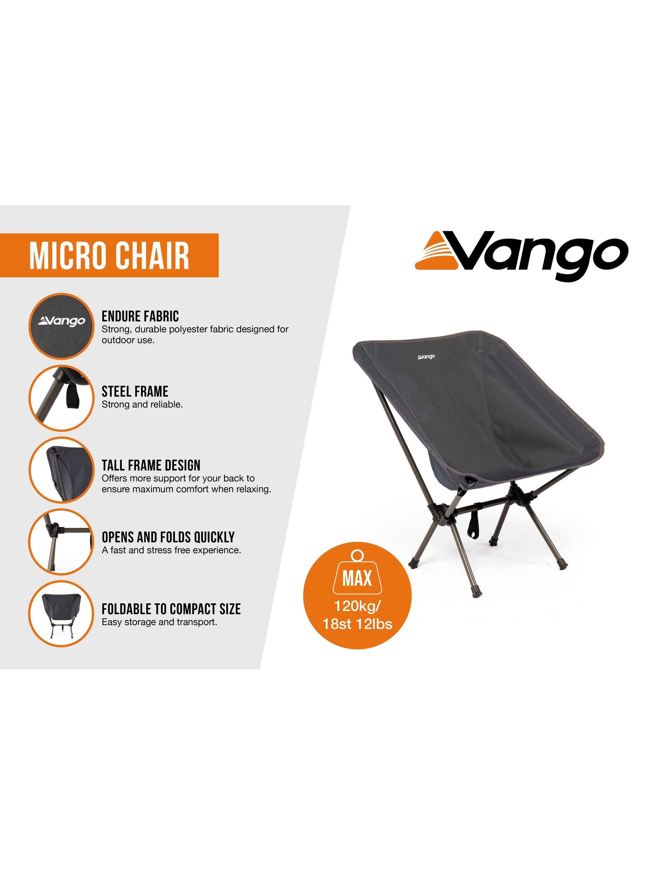 The Vango Micro Folding Chair is a compact, sturdy and durable chair - the perfect match for festival-goers, first-time campers and trekkers. With an incredible pack size and weight of only 1.4kg, the Micro Chair is ideal for those who want to pack light. Simply pack away into the handled carry bag for easy transportation.