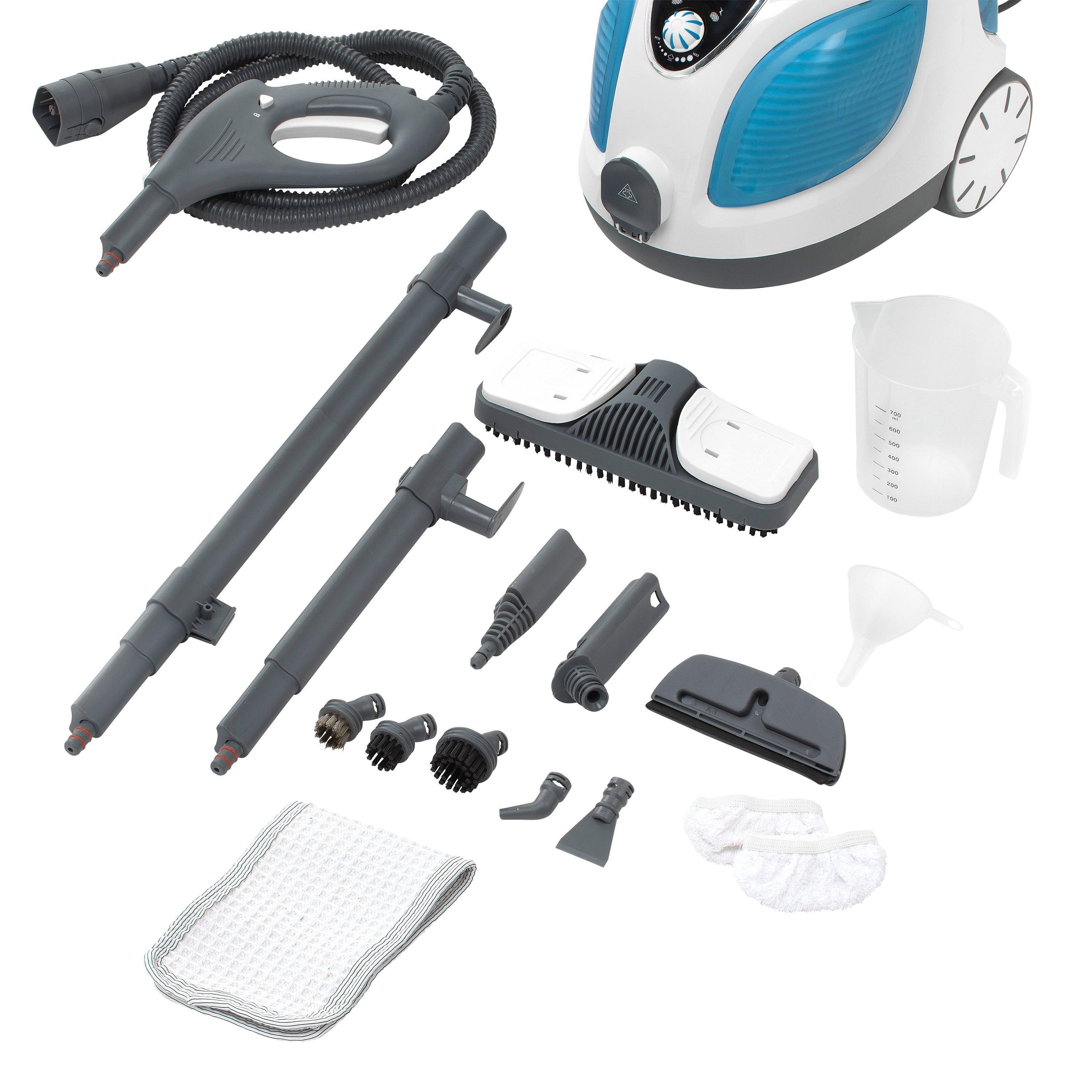 - Floor head, 3pc extension tube, floor head cloth, upholstery/window tool, upholstery tool cloth x2, scraper tool, grout brush, detail nozzle, concentration nozzle, small plastic brush, large plastic brush, funnel, 750ml measuring jug