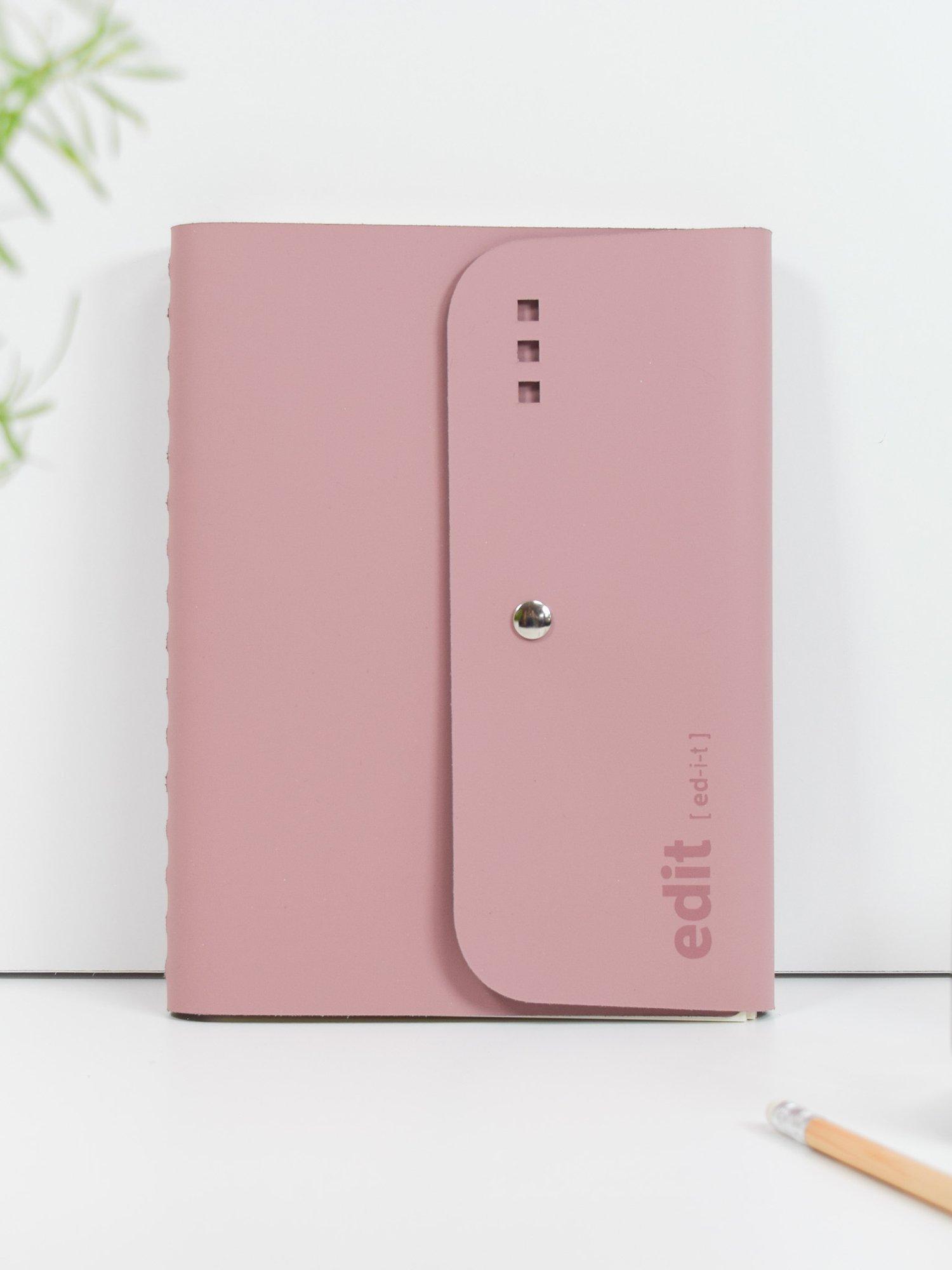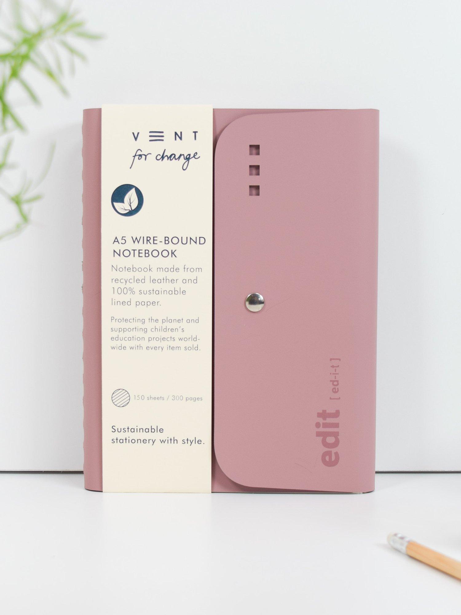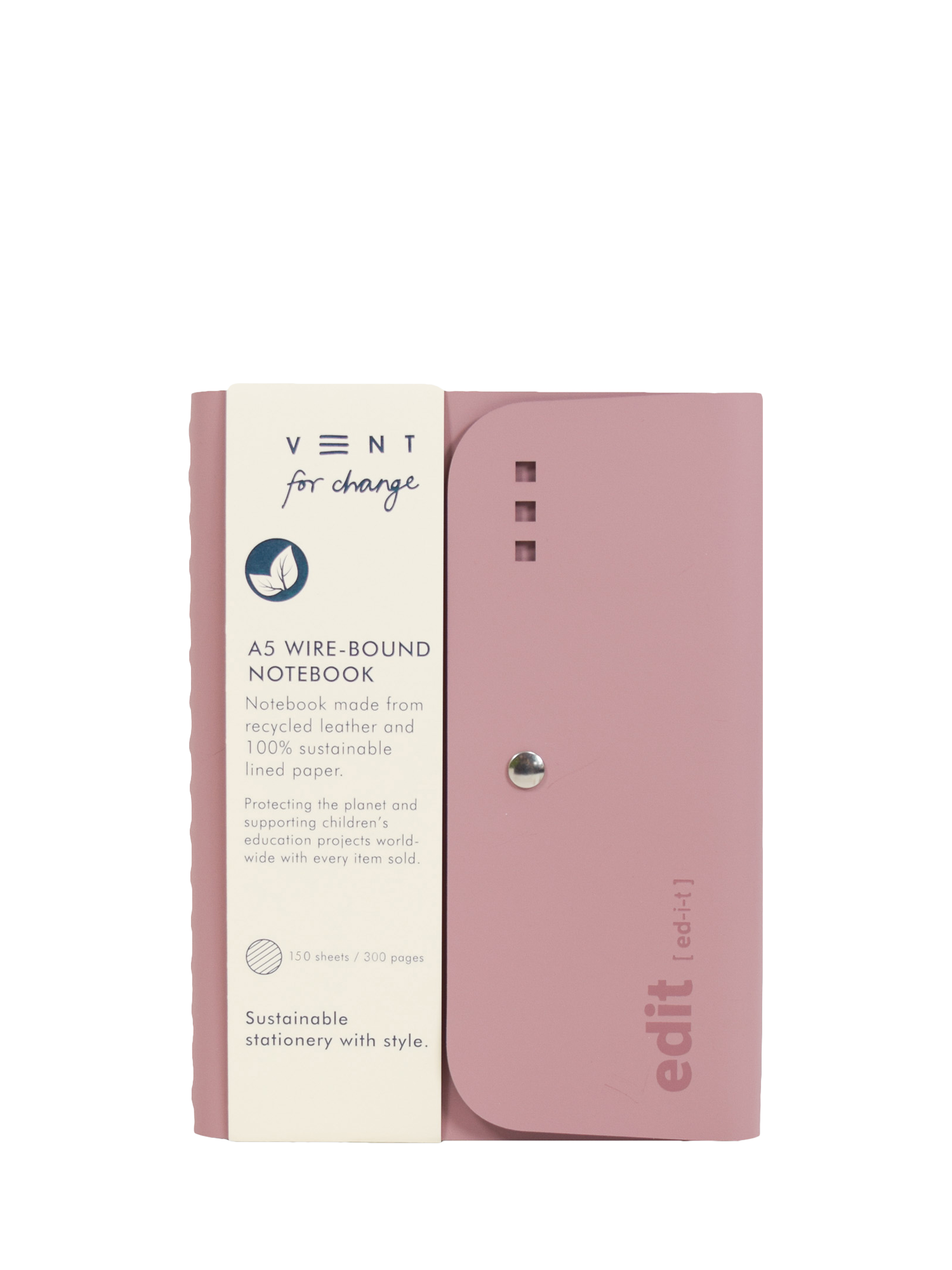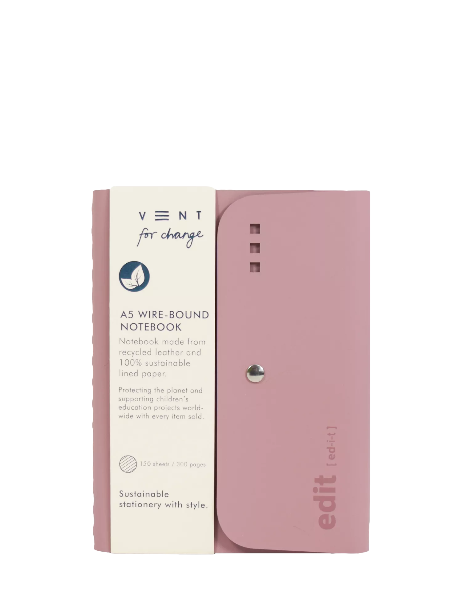 Stylish A5 Wirobound notebook with recycled leather cover and 300 pages of 80gsm off white paper. Foldover recycled leather closure with clasp. Semi rigid soft touch tactile covers debossed with EDIT design.