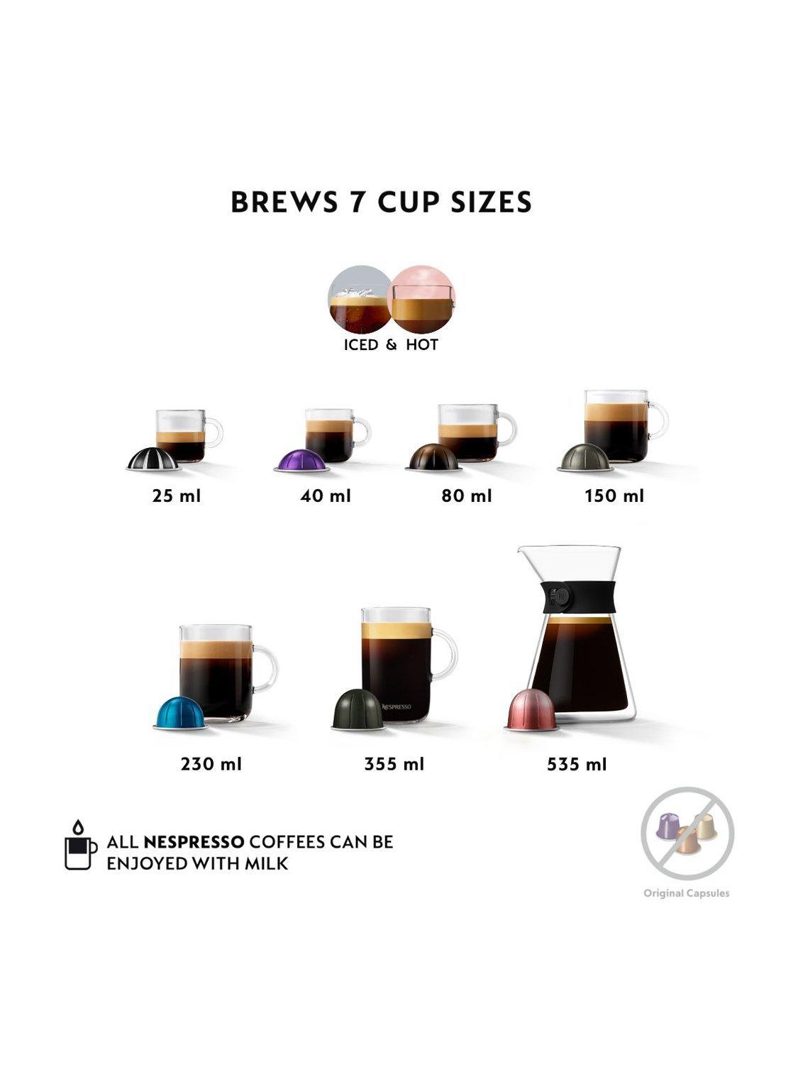 From espressos, to iced or benefit-enhanced coffees, This Vertuo coffee machine extends the range of cup sizes to 7 to deliver Ristretto 25ml, espresso 40ml, double espresso 80ml, gran lungo Cup 150ml, Mug 230ml, Large mug 355ml and carafe 535ml all at the touch of a button, suitable to create your favourite hot or cold coffee shop recipes: Cappuccino, Latte, Flat White, iced recipe. Includes complimentary welcome set of 12 pods.