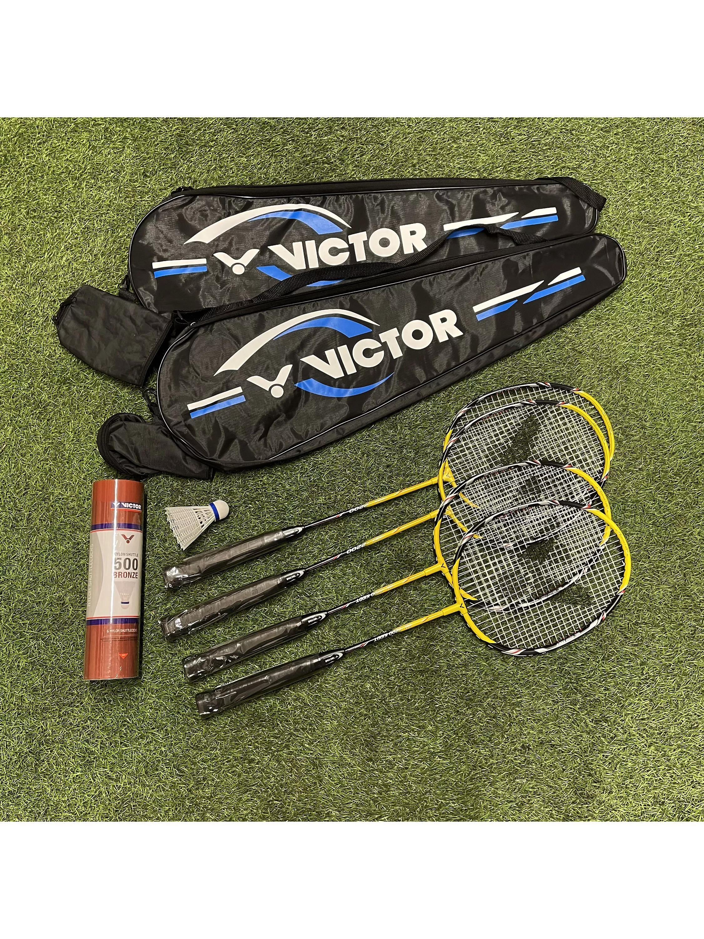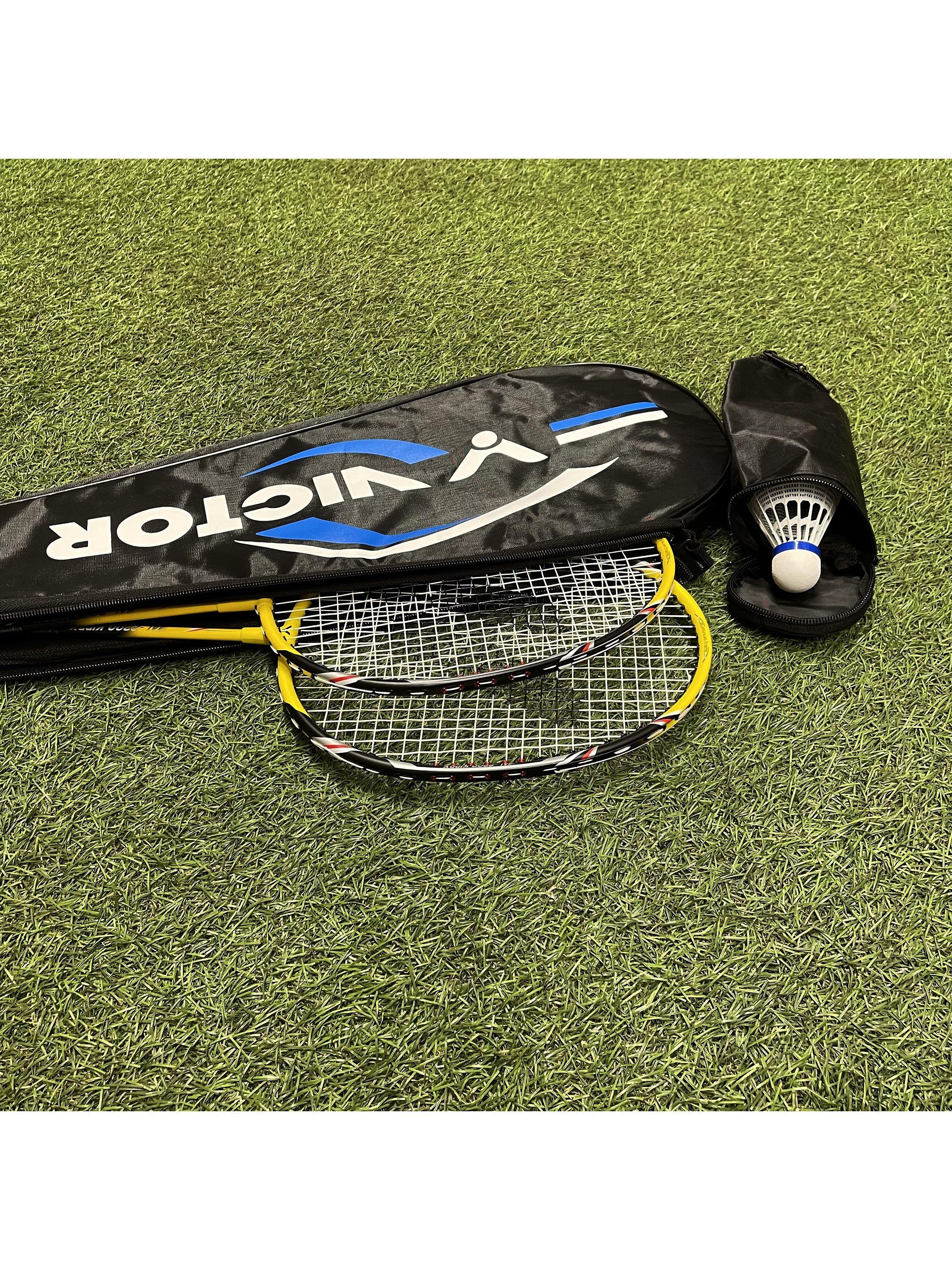 Includes 2 Victor AL-2200 badminton rackets, 2 Victor AL-2200 kiddy badminton rackets, a shuttlecock and 2 racket bags.