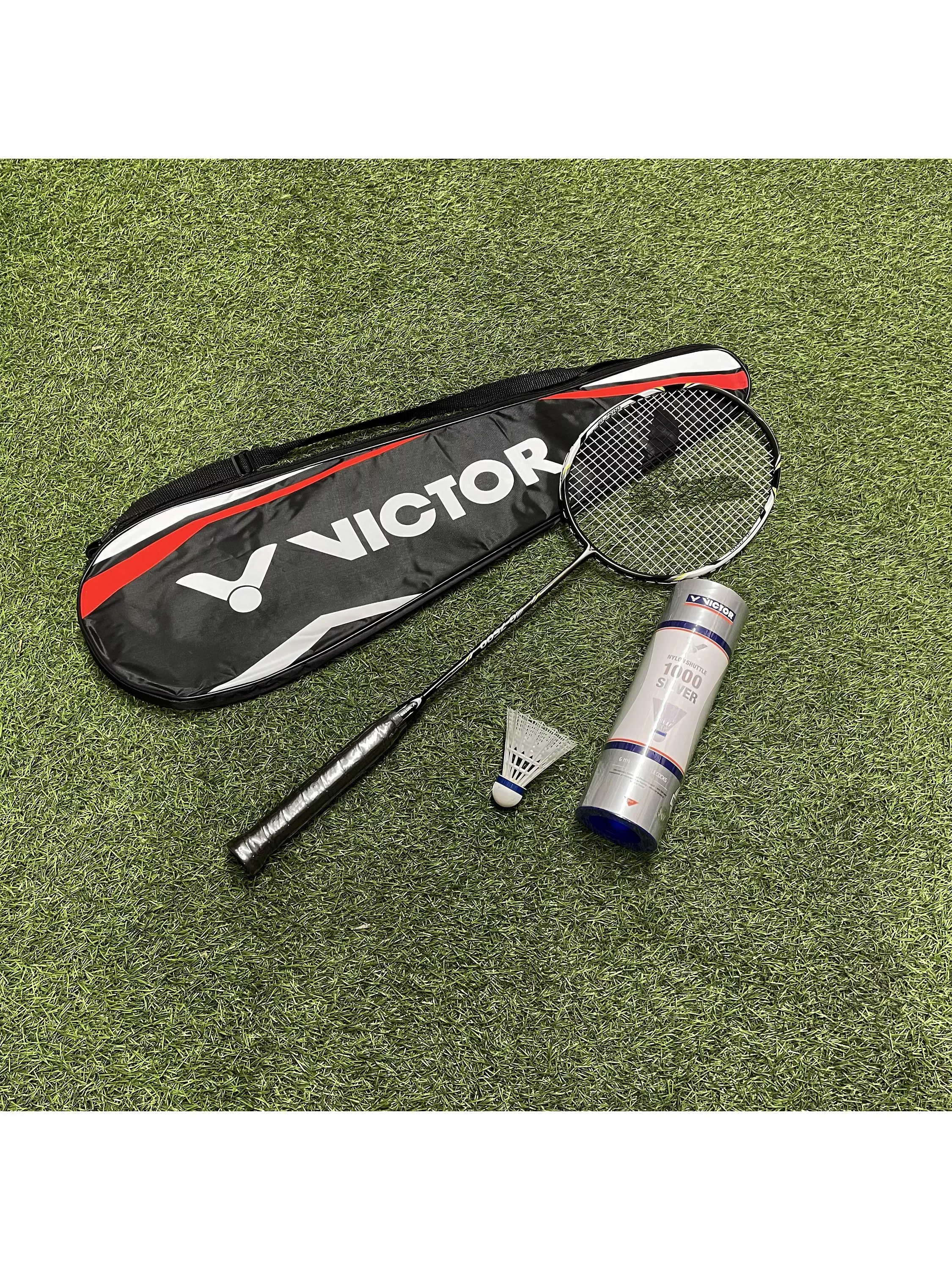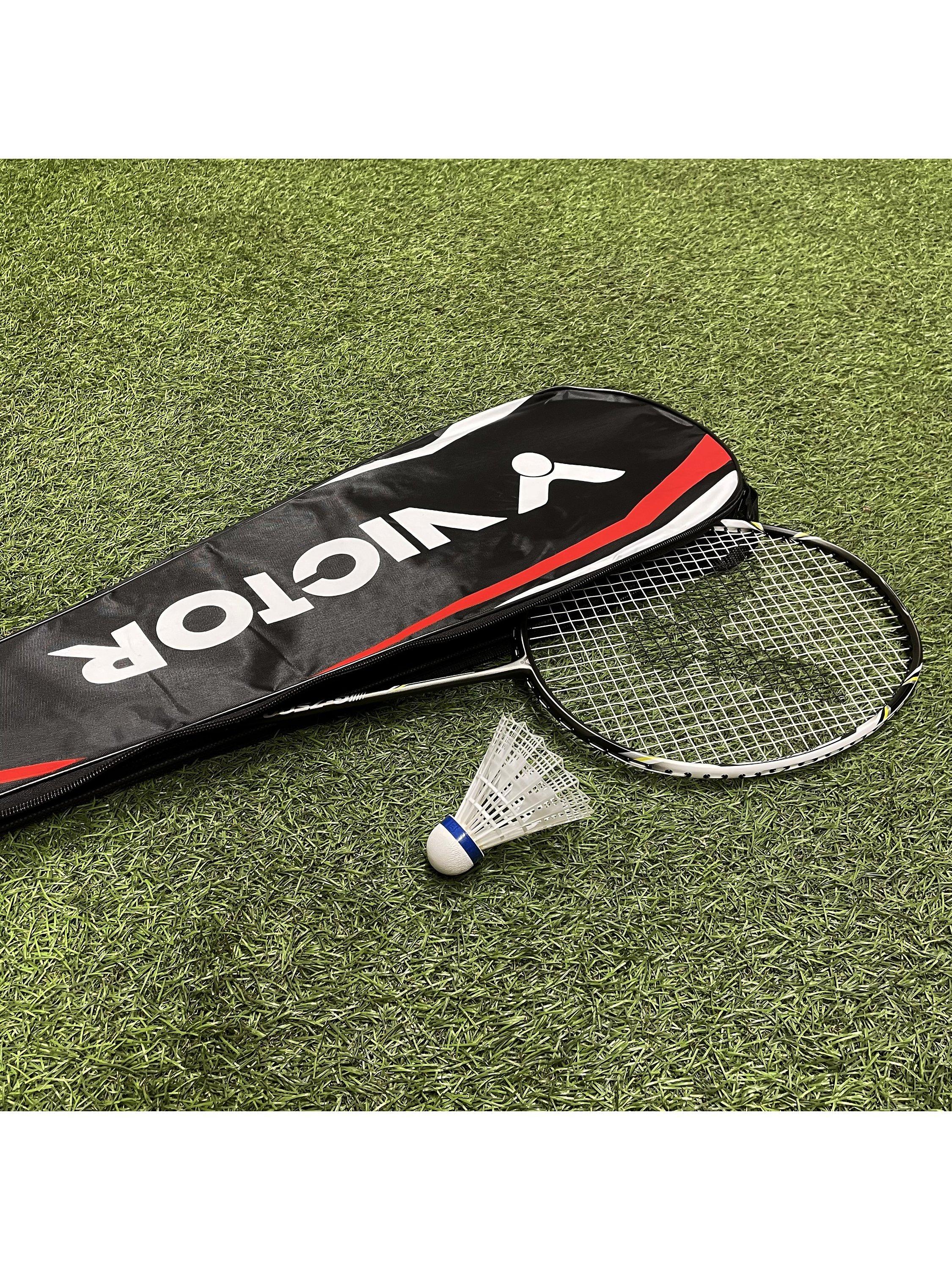 This badminton set includes a Victor G-7500 badminton racket, a tube of 6 nylon shuttlecocks, and a rakcet cover.