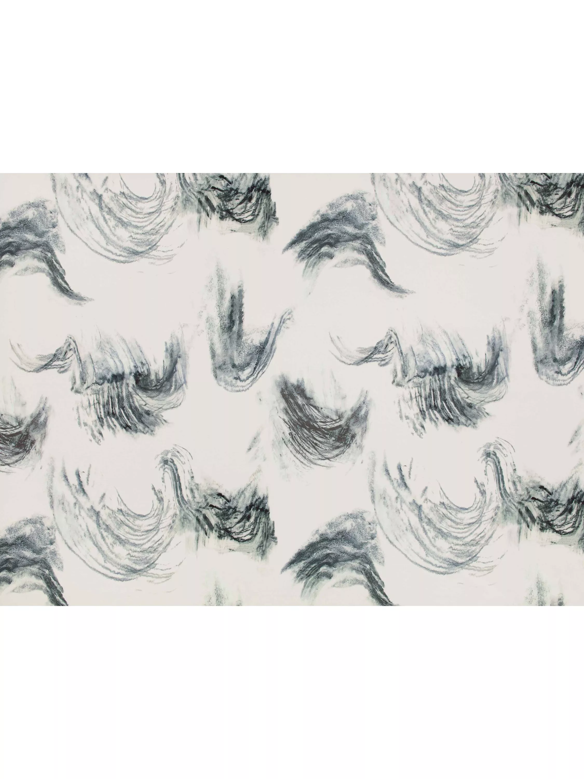 Murmurs features sections of pattern from ceramic artist Kyra Cane's signature pots. The design is reminiscent of starling murmurations with patterns twisting and turning, creating areas of dense colour and tones that fade away to a whisper of shadowy shade. The fluidity and depth of the design is translated perfectly onto a smooth, supple cotton satin cloth.