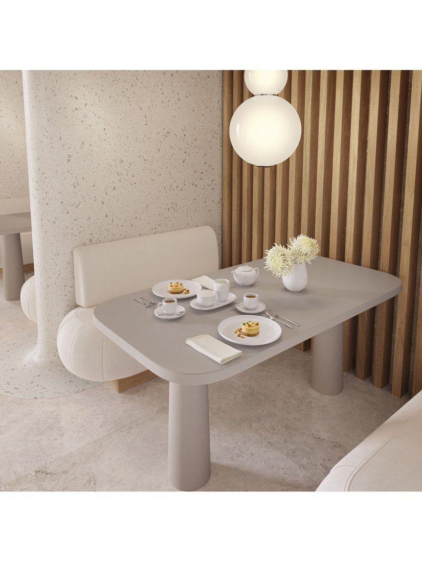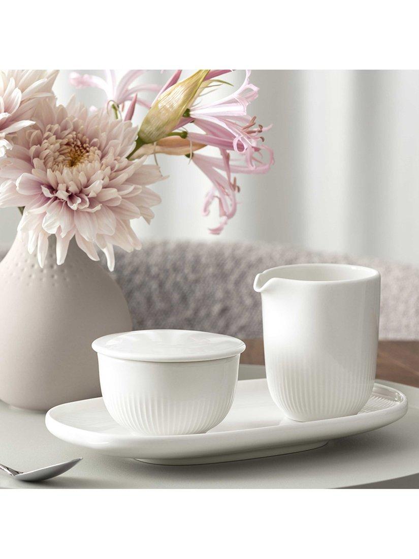 Part of the Afina collection, by Villeroy & Boch inspired by concentric rays of sunshine, the tableware features a tactile ring-shaped relief. The modern coupe shape has a raised rim.