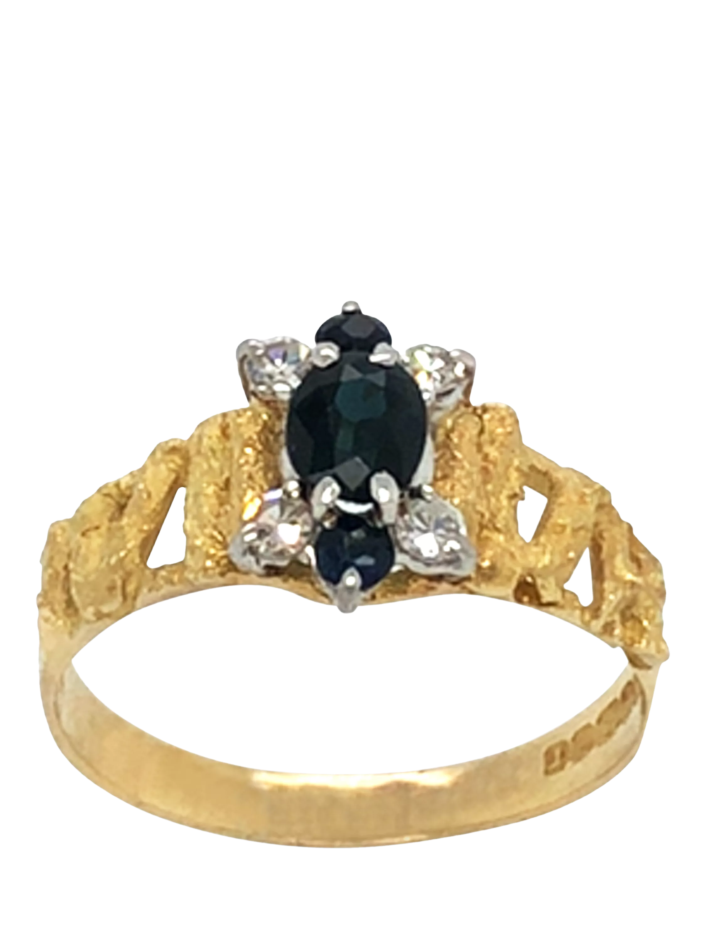 Made from 18ct yellow gold, this retro ring is set with 3 sapphires and 4 diamonds. It is finished with a 'barked' effect shank. Hallmarked and dated Birmingham 1968, it is considered to be in excellent condition.