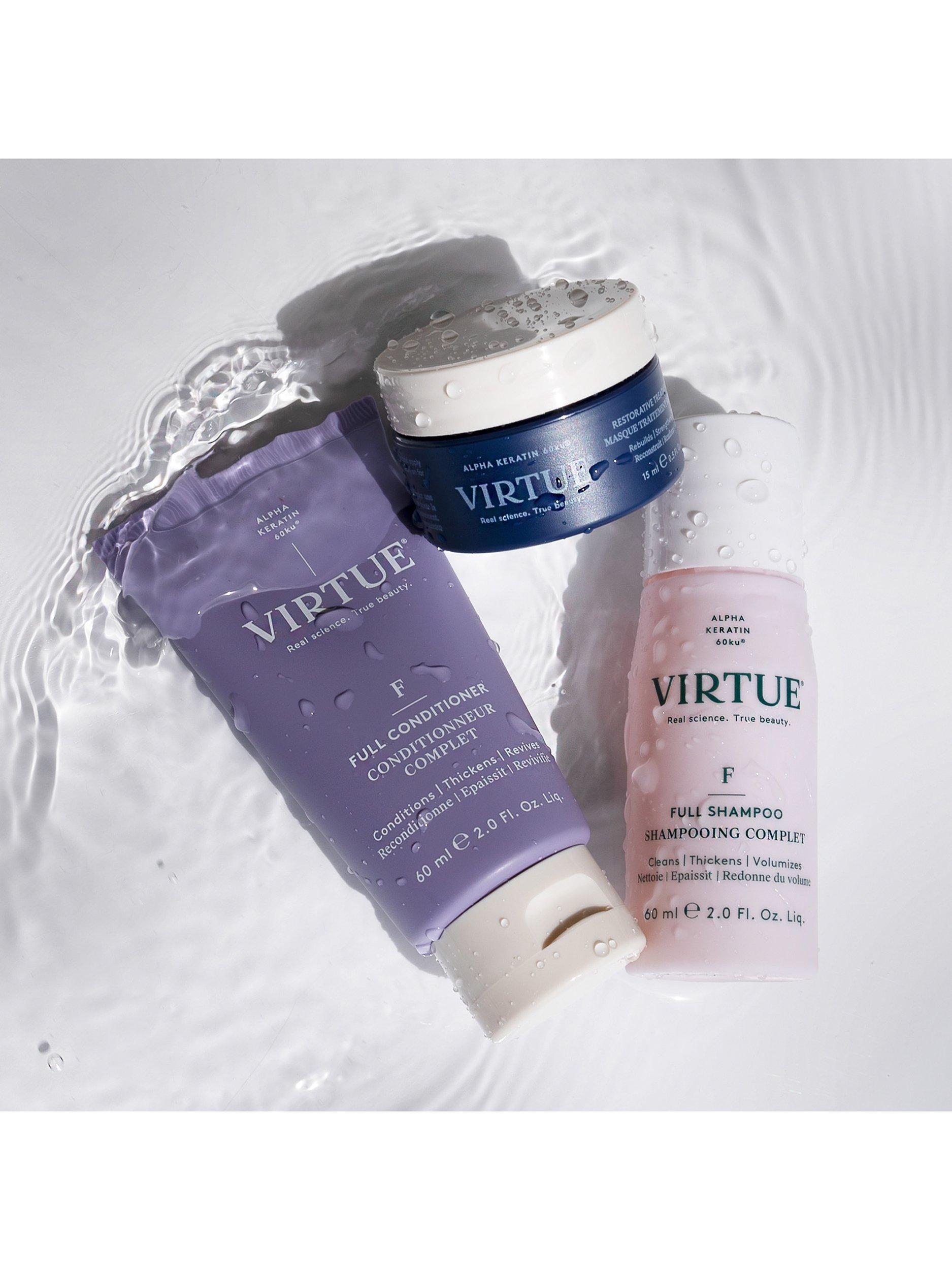 Virtue®’s Full Shampoo and Conditioner volumise, thicken, and strengthen strands while our best-selling Restorative Treatment Mask intensely moisturises hair in three minutes. Each product contains Alpha Keratin 60ku®, a wonder-working protein that repairs hair with each use.