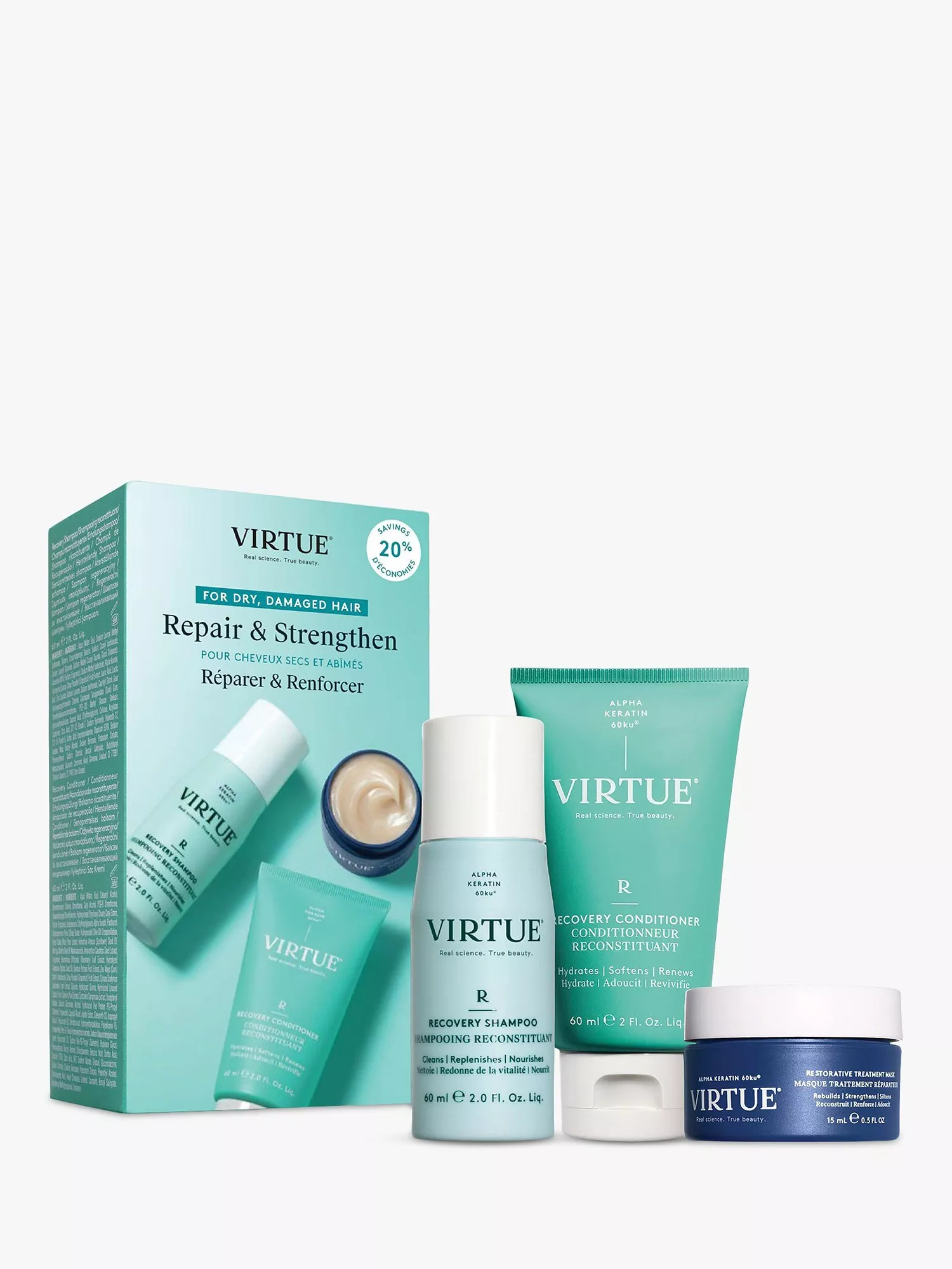Virtue®’s Recovery Shampoo and Conditioner renew damaged, dehydrated, and stressed-out strands while our best-selling Restorative Treatment Mask intensely moisturises hair in three minutes. Each product contains Alpha Keratin 60ku®, a wonder-working protein that repairs hair with each use.