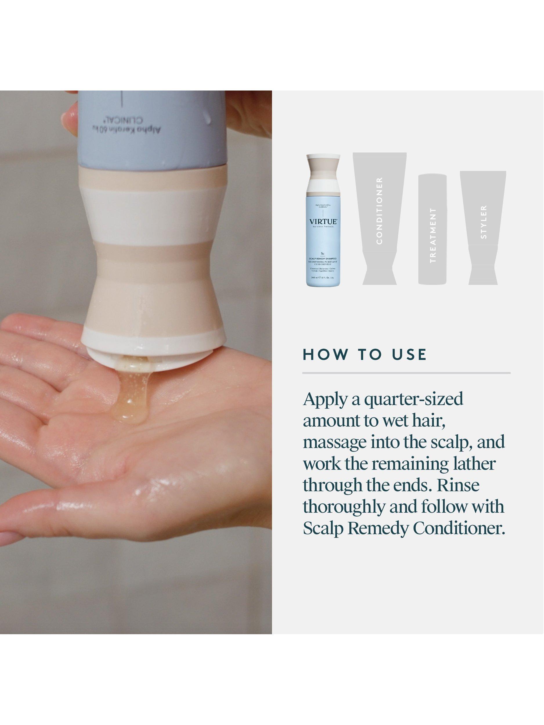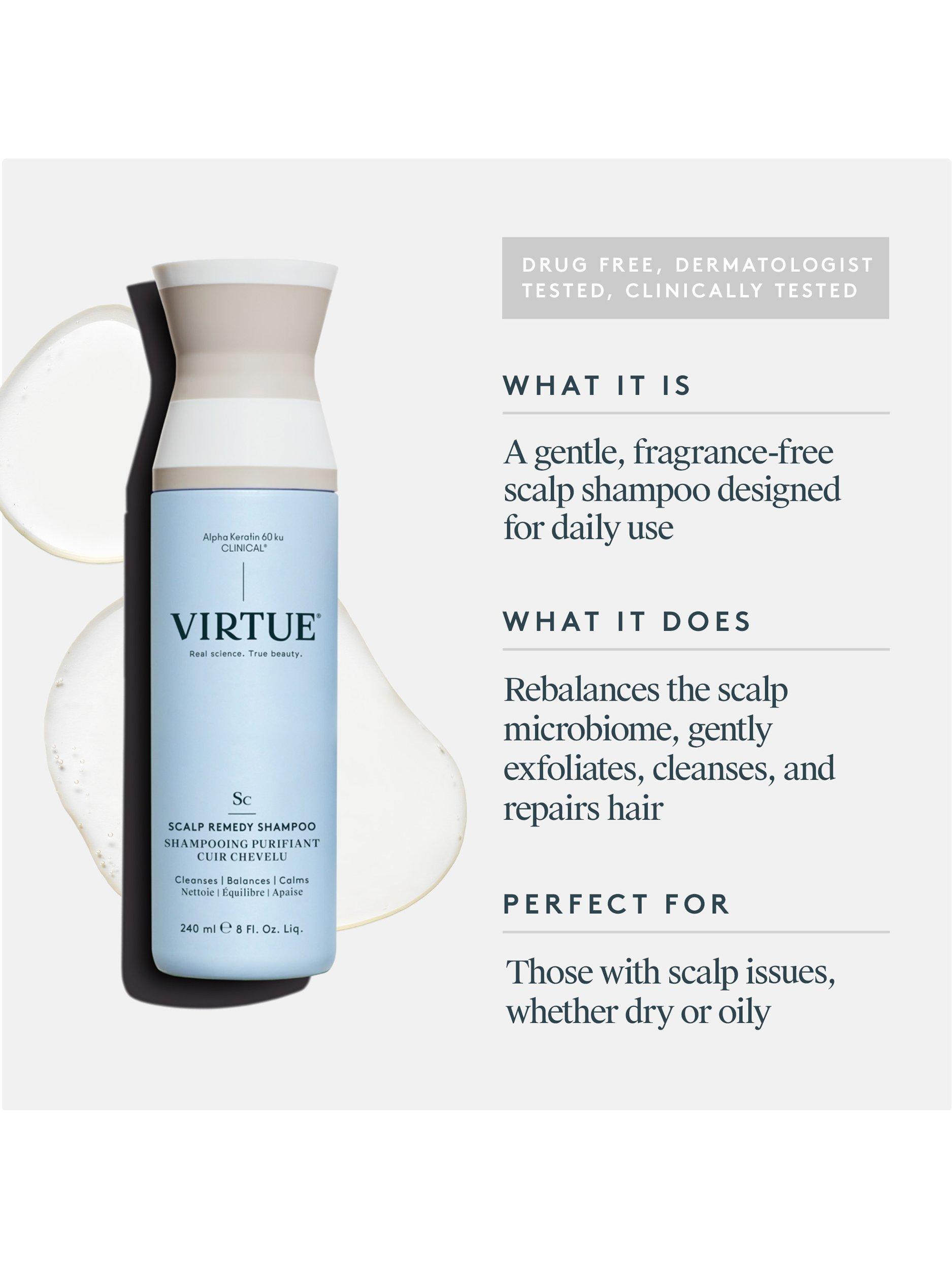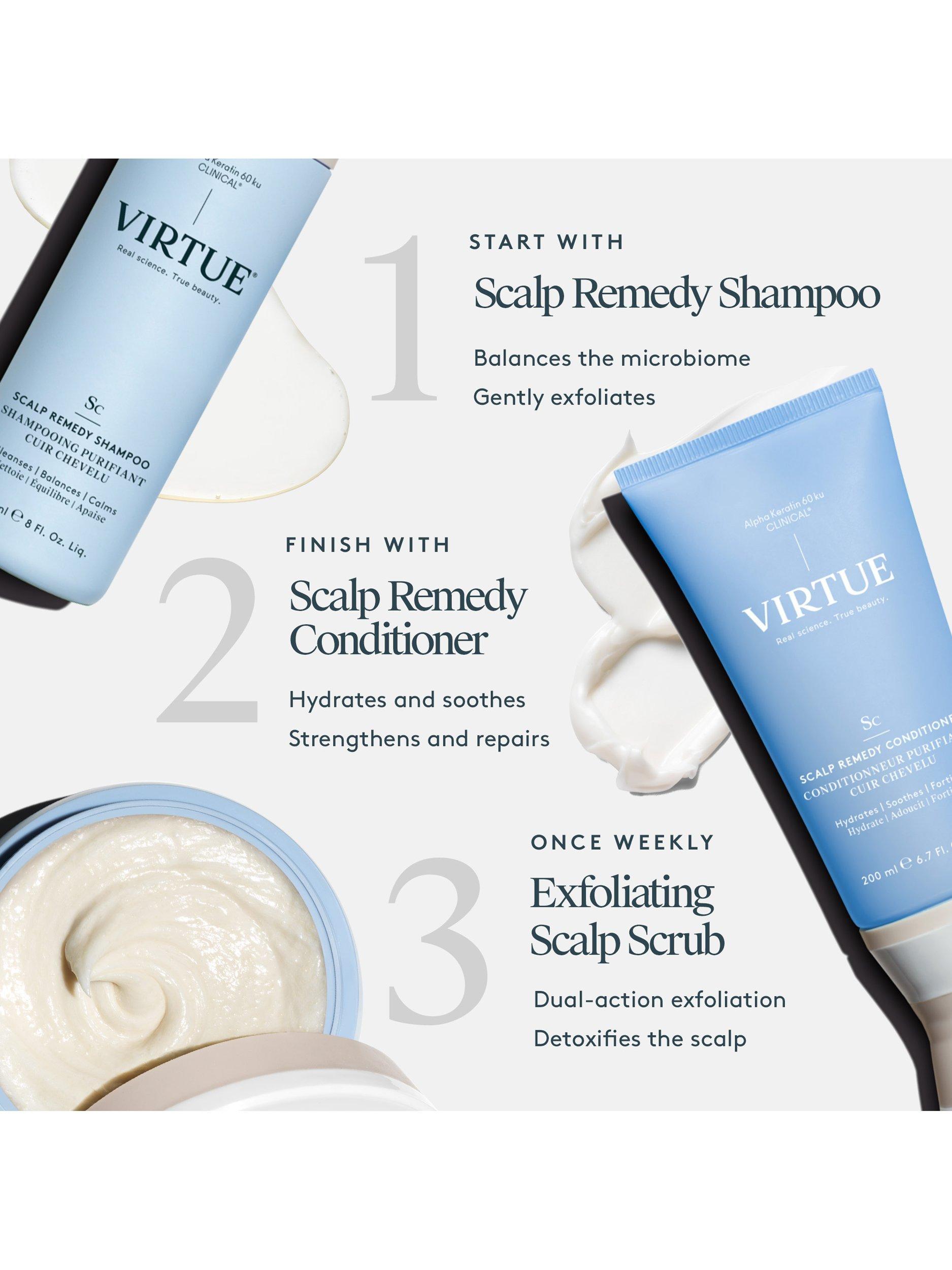 Virtue® Scalp Remedy Shampoo balances the microbiome and nourishes the scalp while gently cleansing, refreshing, and hydrating hair.