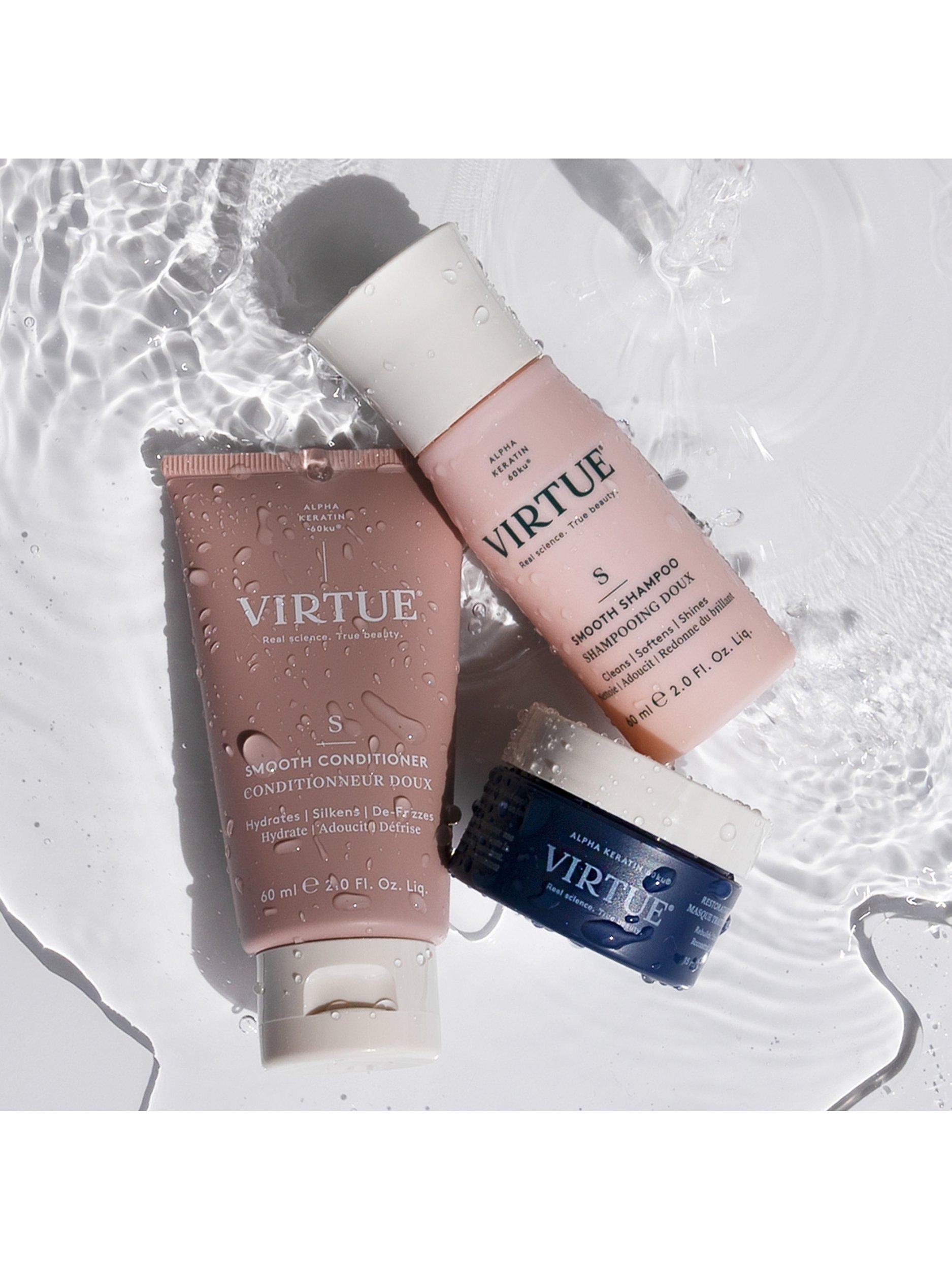 Virtue®’s Smooth Shampoo and Conditioner block out humidity and lock in moisture while our best-selling Restorative Treatment Mask intensely moisturises hair in three minutes. Each product contains Alpha Keratin 60ku®, a wonder-working protein that repairs hair with each use.