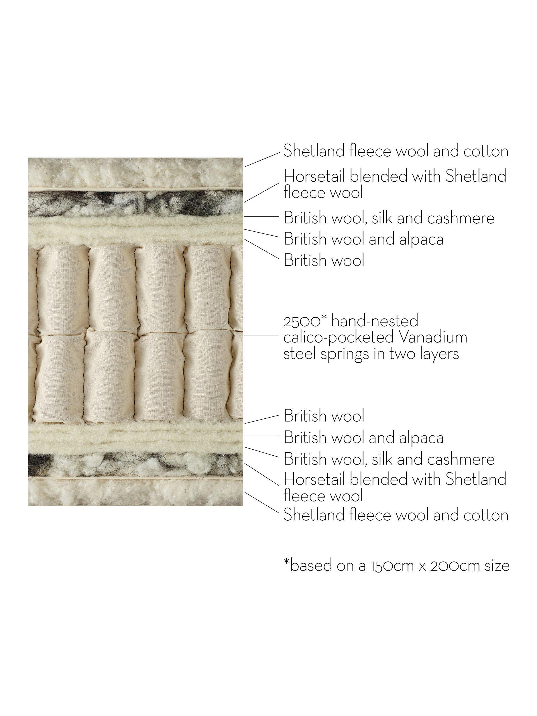 The Richmond mattress has been traditionally handcrafted using some of the most opulent natural fibres, including silk, cashmere and British wool. These naturally temperature-regulating fibres create a plush bounce, and alongside a pocket spring system, the result is a slightly firmer feel mattress that provides pressure relief and support.