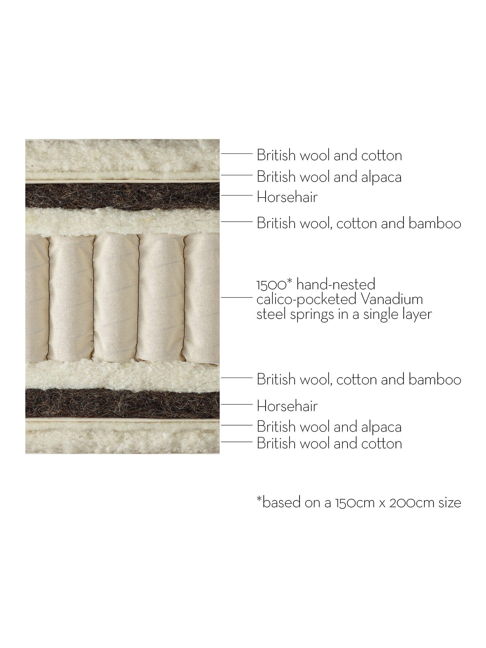 The Wimbledon mattress is handmade with layers of wool, cotton soft alpaca and spring horsehair, alongside a pocket spring system. This combination of luxury natural fillings creates a deep and inviting sleep surface with an excellent feeling of bounce, softness and support.