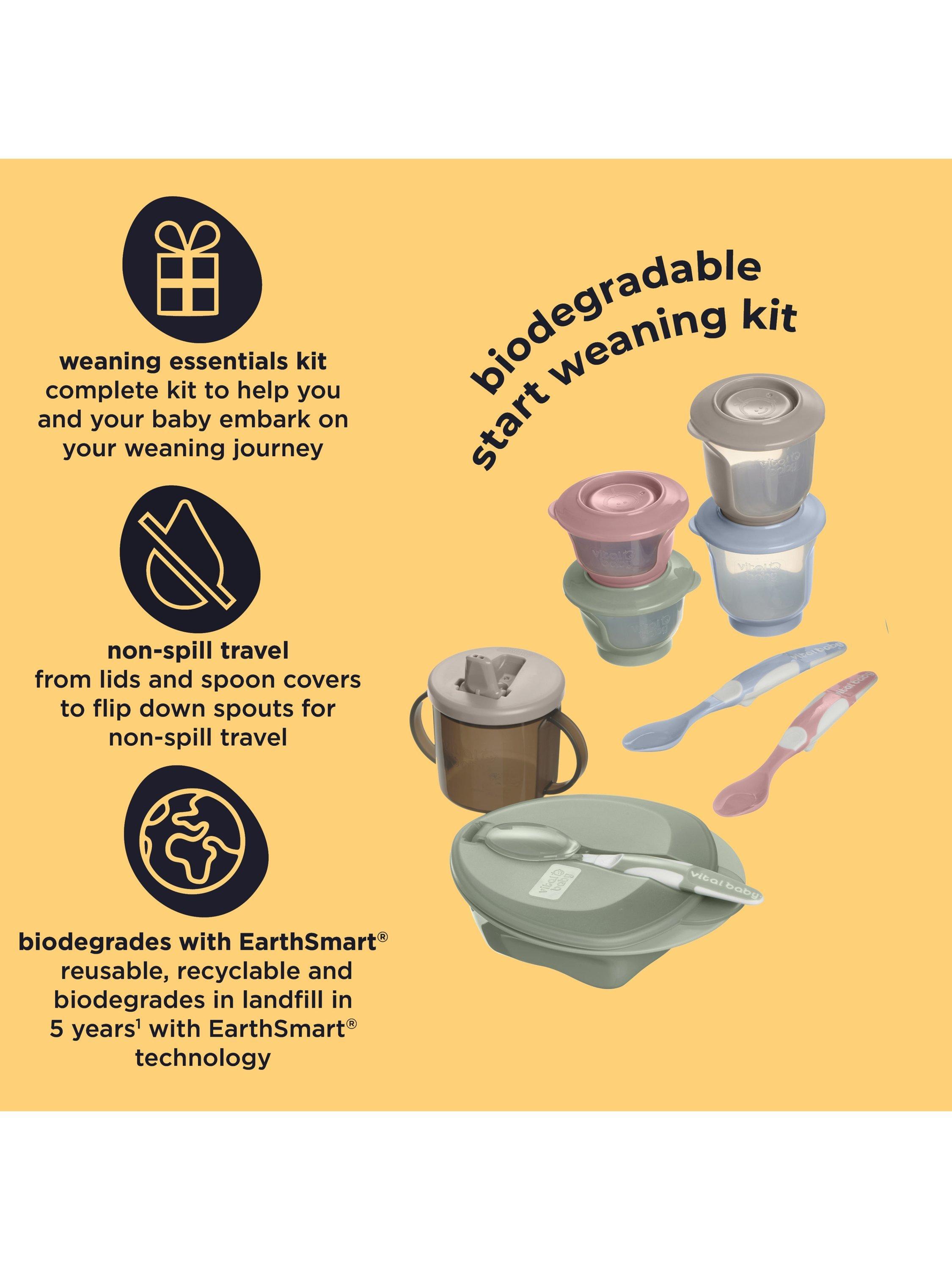 The Nourish Start Weaning Kit by Vital Baby is packed with everything you need to embark on your weaning journey. Start weaning spoons have super soft, shallow tips to ensure you’re offering a manageable amount of food to your baby, gently easing them in to weaning. The long handles have been designed so that they’re comfortable for parents to hold and reach right to the bottom of food jars, and the built-in hygienic footrest helps to keep the tip off the tabletop.